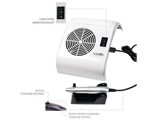 Aspirator praf unghii cu Freza Electrica Tornado Supreme 40W Silver - LUXORISE , alb ofera simultan avantajele unui aspirator pentru praful de unghii si al unei freze profesionale. Mandrina inclusa in pachet se ataseaza la aspirator cu ajutorul unui cablu USB. Dispozitivul are un comutator L/R care permite alegerea sensului de rotatie al bit-ului utilizat si o rotita care regleaza viteza de rotatie a acestuia. Totodata, aspiratorul atrage printr-un design compact si performanta premium . Este dotat cu un motor puternic, care functioneaza cu un nivel redus de zgomot. Specificatii tehnice: Tensiune: 220 - 240V 50 Hz Putere: 40W Freza metalica 20000 rpm inclusa Comutator aspirator ON/OFF Comutator mandrina L/R Culoare: Alb Model: LUX- 980 Pachetul contine: - Aspirator praf unghii - Mandrina - 3 saci de colectare lavabili - Manual de utilizare Se beneficiaza de garantia legala de conformitate asa cum aceasta este reglementata de dispozitiile Legii nr. 296/2004 privind Codul Consumului, cu modificarile si completarile ulterioare coroborate cu dispozitiile OUG nr. 140/2021 privind vanzarea produselor si garantiile asociate acestora, cu modificarile si completarile ulterioare. Produsul cu denumirea Aspirator praf unghii cu Freza Electrica Tornado Supreme 40W Silver - LUXORISE , alb face parte din brandul Luxorise, se afla in categoria Aparatura unghii si subcategoria