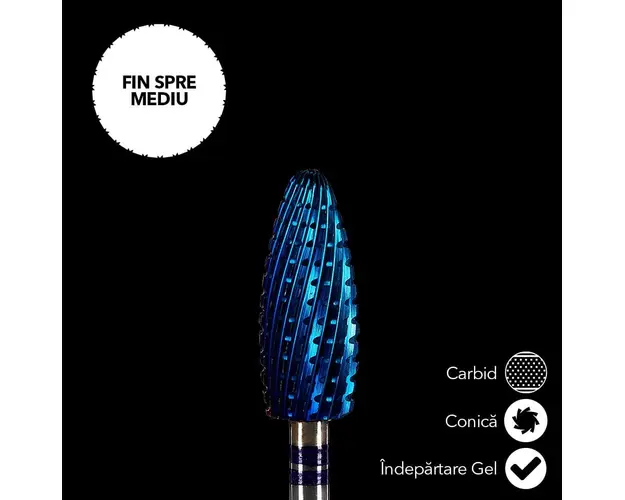 Capat Freza Carbid LUXORISE Conica, duritate medie #223 este compatibila cu orice model de freza de pe piata, avand dimensiune standard. Bitul pentru freza este ideal pentru modificarea si ingrijirea unghiilor naturale si a pielii intarite . Freza este potrivita atat pentru manichiura, cat si pentru pedichiura, deoarece permite manevrarea cu precizie si faciliteaza stilizarea unghiilor. Invelisul din diamant asigura o rezistenta indelungata si nu afecteaza unghia, avand o abraziune fina. Finisajele la cele mai inalte standarde calitative garanteaza un confort inalt in timpul utilizarii. Caracteristici: Diametru:6 mm Lungime: 14,6 mm Lungime totala bit: 50.5 mm Usor de curatat,dezinfectat si sterilizat. Produsul cu denumirea Capat Freza Carbid LUXORISE Conica, duritate medie #223 face parte din brandul Luxorise, se afla in categoria Aparatura unghii si subcategoria