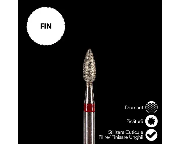 Capat Freza Diamant Cuticule LUXORISE Conica, fina #216 este compatibila cu orice model de freza de pe piata, avand dimensiune standard. Bitul pentru freza este ideal pentru modificarea si ingrijirea unghiilor naturale, a cuticulei si a pielii intarite . Freza este potrivita atat pentru manichiura, cat si pentru pedichiura, deoarece permite manevrarea cu precizie si faciliteaza stilizarea cuticulelor si a unghiilor. Invelisul din diamant asigura o rezistenta indelungata si nu afecteaza unghia, avand o abraziune fina. Finisajele la cele mai inalte standarde calitative garanteaza un confort inalt in timpul utilizarii. Caracteristici: Disipare termica - nu se incinge in timpul utilizarii constante Usor de curatat si dezinfectat Rezistenta la acid, materiale alcaline Forma avantajoasa, care sporeste precizia Universalitate Caracteristici Diametru: 2,6 mm Lungime: 7,4mm Lungime totala bit: 48mm Usor de curatat,dezinfectat si sterilizat. Produsul cu denumirea Capat Freza Diamant Cuticule LUXORISE Conica, fina #216 face parte din brandul Luxorise, se afla in categoria Aparatura unghii si subcategoria
