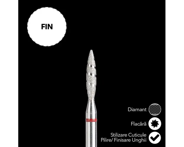 Capat Freza Diamant LUXORISE Flacara, fina #250 este compatibila cu orice model de freza de pe piata, avand dimensiune standard. Bitul pentru freza este ideal pentru modificarea si ingrijirea unghiilor naturale, a cuticulei si a pielii intarite . Freza este potrivita atat pentru manichiura, cat si pentru pedichiura, deoarece permite manevrarea cu precizie si faciliteaza stilizarea cuticulelor si a unghiilor. Finisajele la cele mai inalte standarde calitative garanteaza un confort inalt in timpul utilizarii. Caracteristici Diametru: 2,1 mm Lungime: 10,2 mm Lungime totala bit: 44 mm Usor de curatat,dezinfectat si sterilizat. Produsul cu denumirea Capat Freza Diamant LUXORISE Flacara, fina #250 face parte din brandul Luxorise, se afla in categoria Aparatura unghii si subcategoria