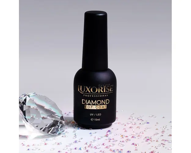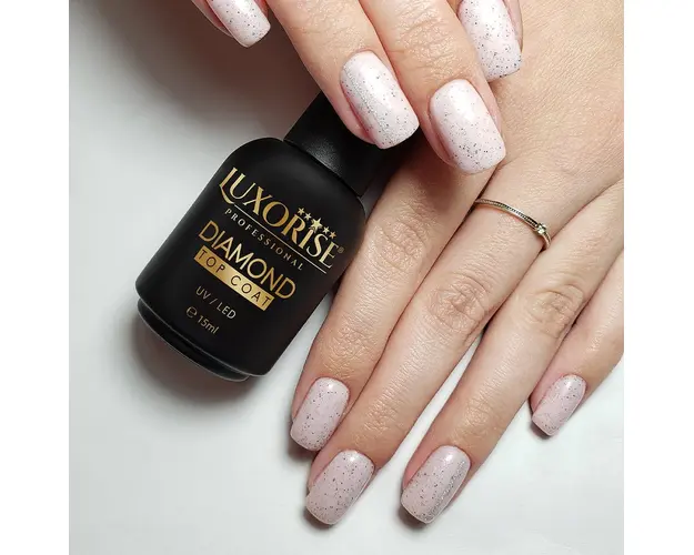 Diamond Top Coat LUXORISE, 15ml este produsul revolutionar ce ofera Intensitate, Rezistenta, Perfectiune! Straluciri unice, sublime pentru manichiuri si pedichiuri cu reflexii de diamante! Formula premium exclusiva protejeaza si intensifica culoarea. In acelasi timp, Diamond Top Coat LUXORISE este elastic si asigura o acoperire uniforma, impecabila. Se aplica un strat subtire la finalizarea manichiurii cu oja semipermanenta, gel, polygel sau acryl. Nu se degreseaza. Diamond Top Coat Formula premium Finish intens Pensula flexibila pentru o aplicare uniforma Nu se fisureaza, zgarie, ingalbeneste Acoperire perfecta Fara strat de dispersie Produs recomandat profesionistilor Compatibilitate mare cu alte produse Cantitate: 15ml Produsul cu denumirea Diamond Top Coat LUXORISE, 15ml face parte din brandul Luxorise, se afla in categoria Aparatura unghii si subcategoria
