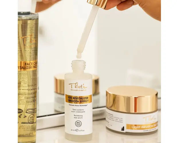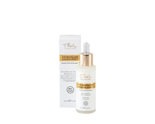 That'so este o marca italiana detinuta de Grupul Quadra, un expert in productia de produse cosmetice de inalta calitate. Compania se specializeaza in conceperea, crearea si fabricarea exclusiv in Italia a diverselor produse cosmetice. Eye Revitalizer Smooth Effect este un ser revitalizant pentru conturul ochilor, cu o textura lejera si absorbtie rapida, conceput pentru a preveni semnele imbatranirii. Tehnologia Botox Drone actioneaza asemanator toxinei botulinice, inhiband contractia musculaturii si reducand adancimea ridurilor. Arbutinul, derivat din hidrochinona si prezent in strugurele ursului, este cunoscut pentru proprietatile sale de iluminare si reducere a cearcanelor. Substantele active ale fenelului si castravetelui completeaza actiunea, oferind o piele luminoasa si revitalizata. Produsul cu denumirea Eye revitalizer smooth effect 30 ml face parte din brandul Butchers son, se afla in categoria Ingrijirea parului si subcategoria