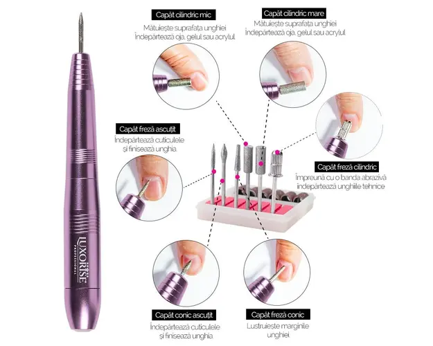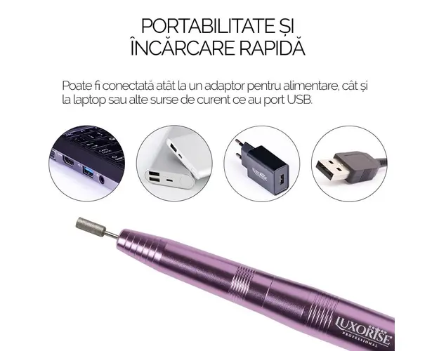 Mandrina Unghii cu Capat USB - LUXORISE, Rose este un device smart ce poate fi conectat cu ajutorul incarcatorului direct la priza sau la orice dispozitiv cu USB - freza unghii, aspirator unghii, lampa UV/ LED unghii, laptop, etc. Dispozitivul are un comutator L/R care permite alegerea sensului de rotatie al bit-ului utilizat si o rotita care regleaza viteza de rotatie a acestuia. Mandrina are viteza reglabila si poate atinge pana la 20.000 RPM. Mod de utilizare: Conectati cu ajutorul incarcatorului direct la priza sau la orice dispozitiv cu USB - freza unghii, aspirator unghii, lampa UV/ LED unghii, laptop, etc. Alegeti sensul de rotatie (F/R) cu ajutorul comutatorului. Setarea vitezei se face gradual de la mica la mare cu ajutorul rotitei. Setati viteza de rotatie recomandata procedurii pe care urmeaza sa o utilizati. Specificatii tehnice: Viteza: 20.000 RPM Tensiune alimentare: 220-240 V 50Hz Culoare: Rose Model: LUX-2000TT Material: Metal Dimensiune mandrina: 13.3 cm Dimensiune cutie: 19.6 x 11.5 x 4.8 cm Greutate: 120g Sens rotatie FWD / REV Pachetul contine: 1 buc x Mandrina 1 buc x Incarcator USB 11 buc x Capete Freza 6 buc x Capete de Slefuit 3 buc x Capete de Silicon 1 buc x Manual de Utilizare Se beneficiaza de garantia legala de conformitate asa cum aceasta este reglementata de dispozitiile Legii nr. 296/2004 privind Codul Consumului, cu modificarile si completarile ulterioare coroborate cu dispozitiile OUG nr. 140/2021 privind vanzarea produselor si garantiile asociate acestora, cu modificarile si completarile ulterioare. Produsele de manichiura din poza secundara au caracter de prezentare si se achizitioneaza separat! Capatul ceramic din poze are caracter de prezentare si se achizitioneaza separat! Produsul cu denumirea Freza Unghii cu Capat USB Titanium Travel - LUXORISE, Rose face parte din brandul Luxorise, se afla in categoria Aparatura unghii si subcategoria