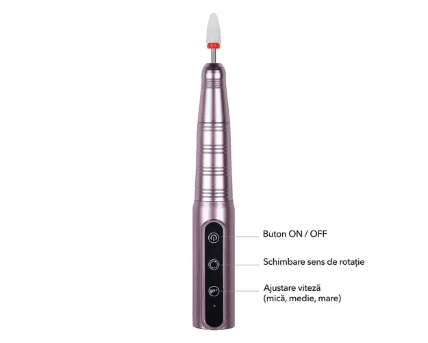 Freza Unghii Portabila Titanium Ultra - LUXORISE, Pink are un design super slim, portabil si performant. Cu baterie incorporata si viteza ce atinge 35.000 de RPM, este potrivita atat pentru profesionisti cat si pentru amatori. Cu un design minimalist foarte practic, Titanium Ultra este perfecta pentru operatiuni de stilizare cuticule, pilire, lustruire, finisare, ascutire dar si pentru alte retusuri. Dispozitivul are un comutator L/R ce permite alegerea sensului de rotatie al bit-ului utilizat. Mandrina are 35.000 RPM. Incarcarea cu energie se poate face de la orice dispozitiv cu USB! Freza Titanium Ultra are trei butoane - pornire / oprire, schimbare sens de rotatie, ajustare viteza. Setarea vitezei se face gradual de la mica la mare, prin apasarea butonui de pe freza (cel de la baza). Pentru modificarea sensului de rotatie, apasati butonul din mijloc. Pentru a porni / opri freza, apasati butonul al treilea. Mod de utilizare: Inainte de utilizare, incarcati freza minim 60 de minute, cu ajutorul incarcatorului din cutie. Apasati cateva secunde pe butonul ON/OFF pentru a pornii freza. Alegeti sensul de rotatie(F/R). Setarea vitezei se face gradual de la mica la mare(in 3 trepte: mica, medie si mare). Pentru a monta capatul de lucru dorit impingeti, iar pentru a indeparta capatul de lucru trageti usor. Specificatii tehnice: ✔️ Viteza: 35.000 RPM ✔️ Tensiune alimentare: 220-240V ✔️ Culoare: Roz ✔️ Material: Metal ✔️ Dimensiune mandrina: 15 x 3cm ✔️ Dimensiune cutie: 17.4 x 7 x 4.9cm ✔️ Greutate: 94g ✔️ Sens rotatie FWD / REV ✔️ Baterie: Li-Ion ✔️ Capacitate baterie: 1200 mAh ✔️ Model: LUX-35TUX Pachetul contine: ✔️ 1 buc x Mandrina ✔️ 1 buc x Capat Ceramica ✔️ 11 buc x Capete Freza ✔️ 6 buc x Capete de Slefuit ✔️ 1 buc x Cablu incarcare USB ✔️ 1 buc x Manual de utilizare Avantaje: ✔️ Design minimalist ✔️ Usor de folosit ✔️ Compacta ✔️ Silentioasa ✔️ Potrivita lustruire, pilire, ascutire, retusuri ✔️ Incarcare prin USB ✔️ Portabila ✔️ Autonomie baterie pana la 6 ore Se beneficiaza de garantia legala de conformitate asa cum aceasta este reglementata de dispozitiile Legii nr. 296/2004 privind Codul Consumului, cu modificarile si completarile ulterioare coroborate cu dispozitiile OUG nr. 140/2021 privind vanzarea produselor si garantiile asociate acestora, cu modificarile si completarile ulterioare. Produsul cu denumirea Freza Unghii Portabila Titanium Ultra - LUXORISE, Pink face parte din brandul Luxorise, se afla in categoria Aparatura unghii si subcategoria