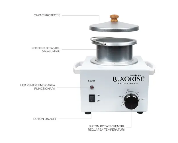 Incalzitor Ceara Traditionala, LUXORISE, 500ml este solutia profesionala, usor de folosit pentru o epilare simpla si rapida! Incalzitorul profesional are o singura cuva incapatoare. Recipientul pentru ceara este complet din aluminiu pentru a sustine activitatea zilnica de epilare fara a se degrada. De aceea saloanele profesionale de frumusete aleg cu incredere acest echipament. Butonul rotativ regleaza orice temperatura doresti de la 60 la 120 C. Indicatorul LED iti arata starea de functionare a aparatului. Incalzitorul iti usureaza procesul de epilare incalzind ceara uniform. In plus, aparatul pastreaza ceara de epilat la temperatura optima pe tot parcursul sedintei de epilare. Astfel obtii rezultate profesionale indiferent de ritmul in care lucrezi. Specificatii tehnice: Capacitate: 500 ml Temperatura: 0-120 C Tensiune: 220-240V 50Hz Putere: 100w Greutate: 1,206 Kg Pachetul contine: 1 buc x Incalzitor ceara electric 1 buc x Capac 1 buc x Manual de utilizare Respectati intotdeauna modul de utilizare. Mod de utilizare: Epilare cu ceara: 1. Asaza incalzitorul pe o suprafata dreapta si rezistenta la temperatura; 2. Asigura-te ca butonul este pe pozitia OFF, apoi conecteaza incalzitorul la priza; 3. Toarna cantitatea de ceara dorita in recipientul incalzitorului si pune capacul; 4. Porneste incalzitorul apasand butonul ON/OFF, cu ajutorul rotitei seteaza incalzitorul la temperatura maxima si incalzeste ceara pana devine complet lichida, apoi pastreaz-o constant la o temperatura medie. Amesteca din cand in cand pentru a verifica soliditatea, ceara este gata de aplicare cand devine cremoasa (supravegheati constant ceara in momentul incalzirii). 5. Asigura-te ca temperatura cerii este confortabila pentru pielea ta. Poti face un test pe o mica portiune a pielii pentru a evita arsurile. 6. Incepe prin curatarea pielii cu Lotiunea inainte de Epilare SensoPRO Milano. Asigura-te ca pielea este complet uscata inainte de aplicarea cerii. 7. Foloseste o spatula pentru a aplica ceara in directia cresterii firelor de par, asteapta cateva secunde pentru a se intari ceara si apoi trage rapid in sens invers cresterii firelor de par. 8. Aplica Ulei dupa Epilare pentru a indeparta reziduurile de ceara si pentru a reduce roseata si iritatiile pielii. Evita expunerea la soare sau la bai fierbinti timp de cateva ore dupa epilare pentru a preveni iritatiile suplimentare. 9. Dupa utilizare, deconecteaza incalzitorul de la priza si curata-l pentru a indeparta resturile de ceara cazute pe acesta. Tratament cu parafina: 1. Asaza incalzitorul pe o suprafata dreapta si rezistenta la temperatura; 2. Asigura-te ca butonul este pe pozitia OFF, apoi conecteaza incalzitorul la priza. 3. Portioneaza parafina si asaza cantitatea dorita in recipientul incalzitorului, apoi pune capacul. 4. Porneste incalzitorul apasand butonul ON/OFF, cu ajutorul rotitei seteaza incalzitorul la temperatura maxima si incalzeste parafina pana cand aceasta devine complet lichida, apoi seteaza incalzitorul la temperatura medie si astepta ca temperatura parafinei sa fie confortabila pentru pielea ta. Poti face un test pe o mica portiune a pielii pentru a evita arsurile (supravegheati constant parafina in momentul incalzirii). 5. Inainte de aplicarea parafinei trebuie sa: dezinfectezi zona dorita, sa masezi usor cu o crema exfolianta si sa clatesti cu apa calduta, apoi aplica un strat gros de crema hidratanta si maseaza usor. 6. Cand parafina ajunge la o temperatura suportabila, aplica pe zona dorita cu o pensula/spatula speciala pentru parafina. 7. Dupa acoperirea completa cu parafina, introdu manile/picioarele mai intai intr-o manusa/soseta de unica folosinta, apoi in manusile/sosetele din bumbac pentru parafina. 8. Asteapta 30min. si indeparteaza parafina. 9. La final aplica un strat de crema hranitoare si maseaza usor. 10. Curatarea incalzitorului se face cu ajutorul unui servetel, cat timp parafina este inca lichida. Ceara si parafina se folosesc exclusiv pentru uz extern. A nu se aplica pe piele sensibila, afectata de leziuni sau pe zone sensibile. A nu se lasa la indemana copiilor . A se evita supraincalzirea. Se recomanda incalzirea precauta. ATENTIE : foarte fierbinte, poate cauza arsuri! Conditii de pastrare: Nu lasati produsul (ceara sau parafina) deschis si nefolosit pentru perioade mari de timp. A se pastra in spatii reci, uscate si aerisite, ferite de lumina directa a soarelui, a umezelii , a materialelor cu potential agresiv, eventuale lovituri, zgarieturi sau deformari. Se beneficiaza de garantia legala de conformitate asa cum aceasta este reglementata de dispozitiile Legii nr. 296/2004 privind Codul Consumului, cu modificarile si completarile ulterioare coroborate cu dispozitiile OUG nr. 140/2021 privind vanzarea produselor si garantiile asociate acestora, cu modificarile si completarile ulterioare. Echipamentele LUXORISE sunt prezente in saloanele de lux si se regasesc in recomandarile de top ale expertilor din industrie. Produsul cu denumirea Incalzitor ceara traditionala 500 ml, LUXORISE face parte din brandul Luxorise, se afla in categoria Epilare si subcategoria