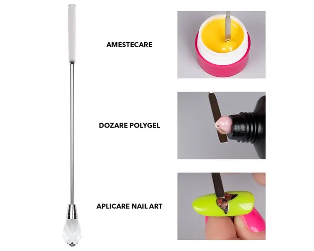 Instrument Manichiura Mixare & Decorare SensoPRO Milano, Crystal White - Spatula din otel inoxidabil este special pentru amestecarea gelului, nail art dar si pentru stilizare si indepartarea diverselor materiale de pe unghii. Forma speciala de spatula permite amestecarea gelului, pudrei acrylice, glitterului, pigmentilor etc. In acelasi timp, forma este perfecta pentru dozarea precisa a polygelului, stilizare si indepartarea surplusului de gel, oja nepolimerizata. Este un instrument multifunctional, perfect atat pentru amatori cat si pentru profesionisti. - Materiale calitate superioara - Utilizare multipla - Usor de curatat - Confortabil & usor de manipulat - Util pentru fixarea stickerelor, tatuajelor, foliilor de transfer - Util pentru dozare polygel Produsul cu denumirea Instrument Manichiura Mixare & Decorare SensoPRO Milano, Crystal White - Spatula face parte din brandul Sensopro milano, se afla in categoria Aparatura unghii si subcategoria