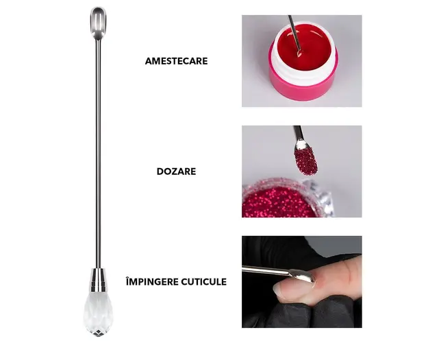 Instrument Manichiura Mixare & Decorare SensoPRO Milano, Crystal White - Spoon din otel inoxidabil este special pentru amestecarea gelului, nail art dar si pentru stilizare si indepartarea diverselor materiale de pe unghii. Forma speciala de lingurita permite atat amestecarea gelului cat si dozarea precisa a pudrei acrylice, glitterului, pigmentilor etc. In acelasi timp, forma curbata este perfecta pentru stilizare si indepartarea surplusului de gel sau oja nepolimerizata. Este un instrument multifunctional, perfect atat pentru amatori cat si pentru profesionisti. - Materiale calitate superioara - Utilizare multipla - Confortabil & usor de manipulat - Usor de curatat Atentie! Gelul colorat din pozele secundare este cu titlu de prezentare si se achizitoneaza separat! Produsul cu denumirea Instrument Manichiura Mixare & Decorare SensoPRO Milano, Crystal White - Spoon face parte din brandul Sensopro milano, se afla in categoria Aparatura unghii si subcategoria