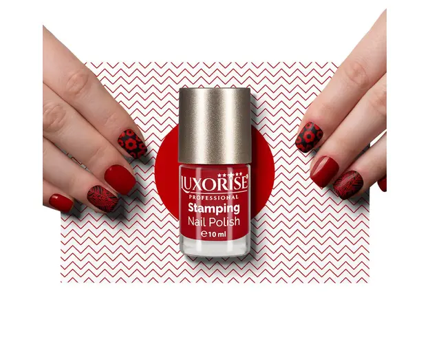 Oja Stampila Unghii LUXORISE, Artist - Red #03 este un produs nou, special creat pentru nail art. Se usuca rapid si este pigmentata, asigurand un efect rezistent si calitativ , in timp ce compozitia are o vascozitate ridicata datorita siliconului care ajuta la fixarea si imprimarea modelelor pe unghii. Tehnica de stampilare a unghiilor este folosita atat de profesionisti, cat si de amatori. Mod de aplicare: 1. Curata unghia si pregateste-o prin aplicarea primer-ului/gelului UV de constructie; 2. Aplica oja/Gelul UV colorat pe unghii; 3. Aplica un strat de Oja Stampila LUXORISE pe matrita; 4. Cu ajutorul racletei indeparteaza excesul de oja de pe model; 6. Apasa stampila pe modelul ales de pe matrita printr-o miscare simpla si aplica pe unghie; 7. Sigileaza manichiura la sfarsit cu un TopCoat. ATENTIE! Ai nevoie de o stampila de unghii si de cel putin o matrita cu modele pentru realizarea de modele cu aceasta oja. Produsul cu denumirea Oja Stampila Unghii LUXORISE, Artist - Red #03 face parte din brandul Luxorise, se afla in categoria Nail art si subcategoria