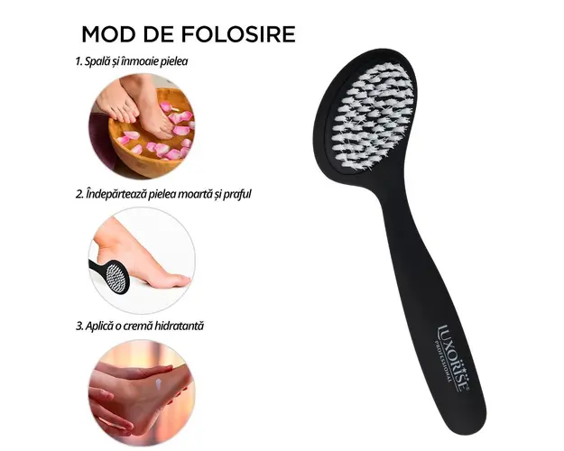 Perie Calcaie Profesionala FastClean PRO LUXORISE este un accesoriu nelipsit din trusa ta pentru ingrijirea picioarelor. Cu ajutorul ei, se indeparteaza foarte usor pielea moarta sau praful rezultat in urma pilirii. Forma moderna si ergonomica o face facil de manevrat. Se curata fara prea mare efort, iar materialele de calitate din care este facuta o fac sa fie rezistenta in timp. Avantaje: - Rezultate profesionale - Materiale calitate superioara - Design practic - Usor de intretinut - Potrivita pentru saloane si uz personal Dimensiuni: 17 x 2.5 cm Produsul cu denumirea Perie Calcaie Profesionala FastClean PRO LUXORISE face parte din brandul Luxorise, se afla in categoria Aparatura unghii si subcategoria