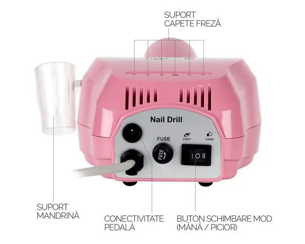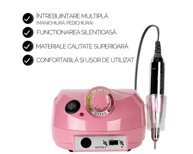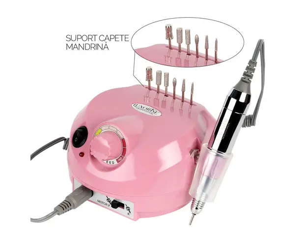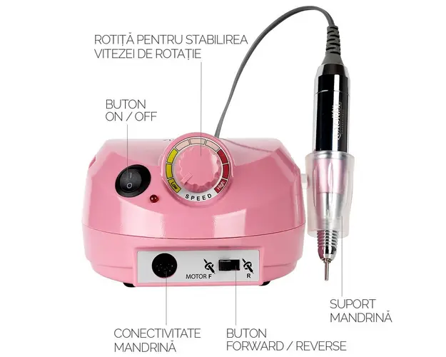 Pila electrica profesionala PowerPRO Elite - LUXORISE , cu viteza de rotatie de pana la 30.000 rotatii pe minut, este solutia pentru eficientizarea muncii de prelucrare si ingrijire a unghiilor. Datorita acestui aparat de unghii profesional, reduci timpul de lucru la minim. Pila electrica profesionala PowerPRO Elite LUXORISE e adecvata operatiunilor de pilire, gravare, slefuire, polizare, ascutire, lustruire, crearea patului unghial. De aceea, produsul este si o buna freza pentru cuticule. Aceasta pila electrica este dotata cu sistem de control al vitezei si comutator avansat de directie (dreapta-stanga). Viteza turatiilor poate fi setata in intervalul 0-30.000 cu ajutorul butonului de reglaj. Motorul nu produce vibratii iar functionarea este silentioasa. Mandrina puternica are sistem Twist-Lock, ce asigura inlocuirea rapida a frezelor. Are greutatea optima pentru manuire si asigura o operare precisa. Pila Electrica Profesionala PowerPRO Elite LUXORISE poate fi utilizata, de asemenea, cu ajutorul pedalei de picior inclusa, pentru un mai mare confort in utilizare. Sfaturi utile pentru o folosire indelungata: Cand freza nu este folosita, aveti grija ca aceasta sa fie oprita de la butornul OFF. Nu este suficient ca modul de lucru sa fie dat la 0. Pentru fiecare schimbare a sensului de rotatie setati mai intai viteza de rotatie la 0 apoi apasati butonul de Reverse / Forward. Nu apasati butonul de Reverse / Forward in timpul functionarii. Exista riscul ca mandrina sa se arda. Mod de utilizare: Conectati freza la priza cu ajutorul alimentatorului apoi apasati butonul ON/OFF. Mandrina se conecteaza in partea din fata a frezei, iar pedala se conecteaza in partea din spate. Pentru a utiliza pedala selectati acest mod cu ajutorul butonului FOOT/HAND din spatele frezei. Cu ajutorul rotitei selectati viteza dorita, apoi apasati pedala pentru a porni freza. Alegeti sensul de rotatie Forward sau Reverse. Setarea vitezei se face gradual, de la mica la mare, cu ajutorul rotitei. Specificatii : Viteza: 0 - 30.000 RPM Putere: 30 W Culoare: Roz Dimensiune: 14 x 5,5 x 9 cm Cod produs: LUX-3900 PRO Sens rotatie FWD / REV Pachetul contine: 1buc x pila electrica profesionala, 1buc x mandrina, 1buc x suport mandrina, 1buc x pedala, 6 x varfuri de polizare, 6 x capete de slefuit, 1x manual de utilizare. Se beneficiaza de garantia legala de conformitate asa cum aceasta este reglementata de dispozitiile Legii nr. 296/2004 privind Codul Consumului, cu modificarile si completarile ulterioare coroborate cu dispozitiile OUG nr. 140/2021 privind vanzarea produselor si garantiile asociate acestora, cu modificarile si completarile ulterioare. Produsul cu denumirea Pila electrica profesionala PowerPRO Elite - LUXORISE , 30.000 RPM, Pink face parte din brandul Luxorise, se afla in categoria Aparatura unghii si subcategoria