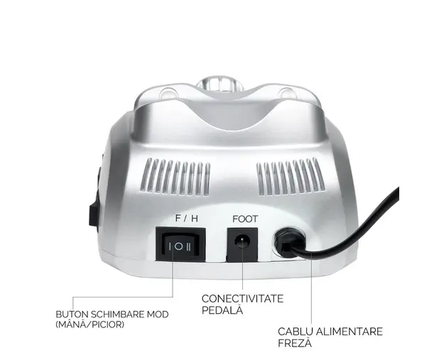 Pila Electrica Profesionala PowerPRO Ultra - LUXORISE este o pila electrica puternica (30.000 RPM), pentru manichiura si pedichiura. Recomandata saloanelor de infrumusetare si tehnicienilor de unghii. Unitatea centrala cu design modern este realizata din materiale de calitate. In plus, mandrina cu elemente metalice este robusta si usor de utilizat. Pila implineste rapid si cu rezultate optime urmatoarele operatiuni: pilire, slefuire, polizare, ascutire, lustruire si crearea patului unghial. Este dotata cu sistem de control al vitezei. Tehnicianul poate alege cu usurinta viteza de lucru cu ajutorul butonului de reglaj. Are protectie la suprasarcina si oprire de siguranta. Mandrina puternica a acestei pile electrice lucreaza silentios, fara vibratii. Pentru un mai mare confort, pila electrica poate fi actionata cu ajutorul pedalei incluse. Pachetul contine: o pila electrica profesionala, mandrina, pedala, 6 varfuri de polizare, 6 capete de slefuit, un manual de utilizare. Sfaturi utile pentru o folosire indelungata: Cand freza nu este folosita, aveti grija ca aceasta sa fie oprita de la butornul OFF. Nu este suficient ca modul de lucru sa fie dat la 0. Pentru fiecare schimbare a sensului de rotatie setati mai intai viteza de rotatie la 0 apoi apasati butonul de Reverse / Forward. Nu apasati butonul de Reverse / Forward in timpul functionarii. Exista riscul ca mandrina sa se arda. Mod de utilizare: Conectati mandrina in partea din dreapta a frezei, apoi conectati freza la priza cu ajutorul alimentatorului. Apasati butonul ON/OFF pentru a pornii freza. Pedala se conecteaza in partea din spate a frezei, selectati acest mod cu ajutorul butonului F/H. Alegeti sensul de rotatie apoi cu ajutorul rotitei alegeti viteza dorita. Apasati pedala pentru a porni freza. Setarea vitezei se face gradual, de la mica la mare, cu ajutorul rotitei. Setati viteza recomandata procedurii pe care urmeaza sa o utilizati. Specificatii tehnice: Viteza: 30.000 RPM Putere: 30 W Culoare: Argintiu Dimensiune: 11,8 x 15,5 x 7,1 Cod produs: LUX-3800 PRO Sens rotatie FWD / REV Pachetul contine: - freza electrica - set de capete freza - pedala - suport pentru mandrina - instructiuni de utilizare Se beneficiaza de garantia legala de conformitate asa cum aceasta este reglementata de dispozitiile Legii nr. 296/2004 privind Codul Consumului, cu modificarile si completarile ulterioare coroborate cu dispozitiile OUG nr. 140/2021 privind vanzarea produselor si garantiile asociate acestora, cu modificarile si completarile ulterioare. Produsul cu denumirea Pila Electrica Profesionala PowerPRO Ultra - LUXORISE , 30.000 RPM, Silver face parte din brandul Luxorise, se afla in categoria Aparatura unghii si subcategoria