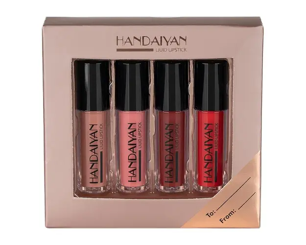 O noua colectie in editie speciala cu efect mat pentru buzele tale incepe cu Set 4 Rujuri Lichide Mate Handaiyan #02! Tendintele sezonului iti aduc un nou set cu finish mat ce atrage lumina si ofera buzelor tale un aspect radiant. Fiind intens pigmentate, ai nevoie de o singura aplicare pentru ca buzele tale sa iasa in evidenta. Ingredientele continute de noile rujuri lichide mate asigura hidratarea intensa a buzelor. Nuantele Set 4 Rujuri Lichide Mate Handaiyan #02 se potrivesc tuturor tipurilor de ten si sunt ideale pentru un machiaj de zi, dar si pentru unul de seara. Rujul lichid mat este rezistent la transfer si foarte usor de indepartat cu demachiant. Formula noua nu este lipicioasa, pastreaza un aspect sanatos si fresh al buzelor. Defineste-ti buzele, alege un look electrizant obtinut cu Set 4 Rujuri Lichide Mate Handaiyan #02! Recomandari: Pentru un aspect perfect si un finish de durata este necesara hidratarea buzelor in prealabil. Recomandarea make-up artistilor: Aplicati putin fond de ten pe buze inainte de folosirea rujului, pentru a obtine o nuanta fidela cu cea din imaginea de prezentare. Culoarea produsului poate diferi in functie de luminozitatea ecranului, dar si de pigmentul natural al buzelor. Produsul cu denumirea Set 4 Rujuri Lichide Mate Handaiyan #02 face parte din brandul Handaiyan, se afla in categoria Machiaj si subcategoria