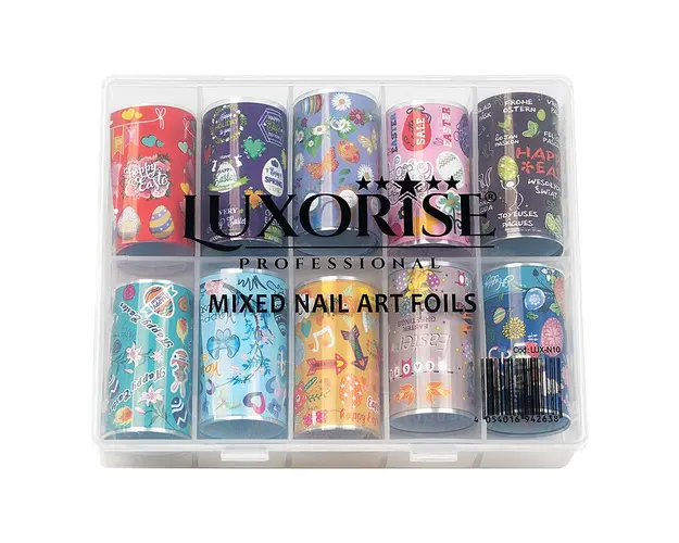 Set Folii Transfer LUXORISE #65 Easter Fun, 10 buc contine 10 tipuri de folii ce iti ofera diversitate atunci cand iti faci manichiura. Foliile de transfer sunt ideale pentru decorul unghiilor false sau al unghiilor naturale. Poti folosi folia de transfer pe intreaga suprafata a unghiei sau doar pentru a crea modele inedite de nail art. Aceasta ramane pe unghie doar in zona in care se aplica lipiciul special pentru folii. Lipiciul pentru foliile de transfer se poate aplica direct pe unghie sau peste un strat de lac de unghii apropiat de culoarea foliei. Mod de utilizare: Aplica lipiciul special pe toata suprafata unghiei sau doar in zona unde urmeaza sa aplici folia de transfer. Asteapta aproximativ 2-3 minute sa se usuce lipiciul. Cand acesta se usuca, devine transparent. Aplica folia pe unghie si preseaza pentru a intinde folia uniform pe suprafata acesteia. Trage folia, iar modelul va ramane transferat pe unghie in forma in care a fost aplicat lipiciul. Produsul cu denumirea Set Folii Transfer LUXORISE #65 Easter Fun, 10 buc face parte din brandul Luxorise, se afla in categoria Nail art si subcategoria