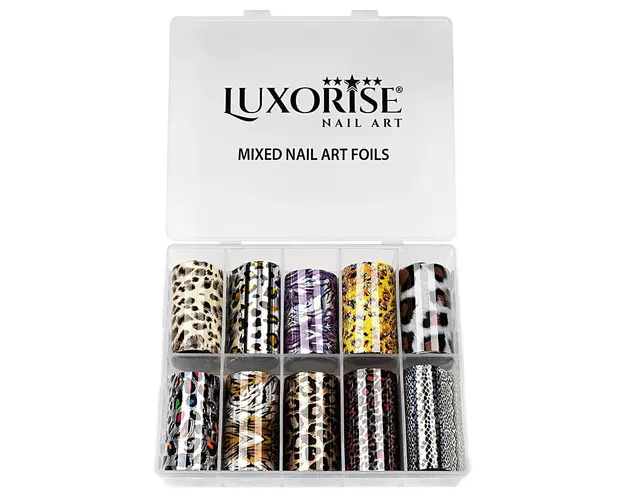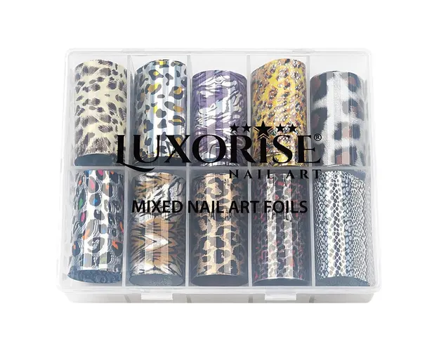 Set Folii Transfer LUXORISE Animal Print Effect, 10 buc contine 10 tipuri de folii ce iti ofera diversitate atunci cand iti faci manichiura. Foliile de transfer sunt ideale pentru decorul unghiilor false sau al unghiilor naturale. Poti folosi folia de transfer pe intreaga suprafata a unghiei sau doar pentru a crea modele inedite de nail art. Aceasta ramane pe unghie doar in zona in care se aplica lipiciul special pentru folii. Lipiciul pentru foliile de transfer se poate aplica direct pe unghie sau peste un strat de lac de unghii apropiat de culoarea foliei. Mod de utilizare: Aplica lipiciul special pe toata suprafata unghiei sau doar in zona unde urmeaza sa aplici folia de transfer. Asteapta aproximativ 2-3 minute sa se usuce lipiciul. Cand acesta se usuca, devine transparent. Aplica folia pe unghie si preseaza pentru a intinde folia uniform pe suprafata acesteia. Trage folia, iar modelul va ramane transferat pe unghie in forma in care a fost aplicat lipiciul. Produsul cu denumirea Set Folii Transfer LUXORISE Animal Print Effect, 10 buc face parte din brandul Luxorise, se afla in categoria Nail art si subcategoria