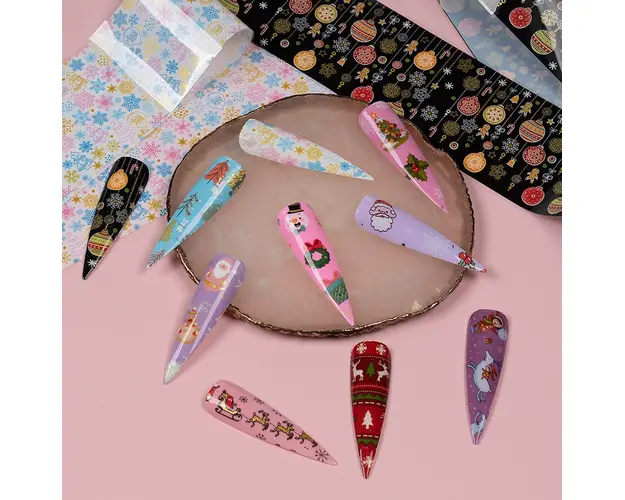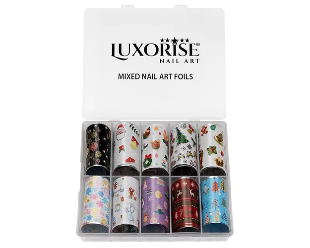 Set Folii Transfer LUXORISE Christmas Fun, 10 buc sunt ideale pentru decorul unghiilor tehnice dar pot fi folosite si pentru nail art pe unghiile naturale. Folia de transfer se poate folosi pe intreaga suprafata a unghiei sau doar pe o portiune pentru a crea modele creative de nail art. Aceasta ramane pe unghie doar in zona in care se aplica lipiciul special pentru folii. Lipiciul pentru foliile de transfer se poate aplica direct pe unghie sau peste un strat de lac de unghii apropiat de culoarea foliei. Mod de utilizare: Aplica lipiciul special pe toata suprafata unghiei sau doar in zona unde urmeaza sa aplici folia de transfer. Asteapta aproximativ 2-3 minute sa se usuce lipiciul. Cand acesta se usuca, devine transparent. Aplica folia pe unghie si preseaza pentru a intinde folia uniform pe suprafata acesteia. Trage folia, iar modelul va ramane transferat pe unghie in forma in care a fost aplicat lipiciul. Set 10 buc Produsul cu denumirea Set Folii Transfer LUXORISE Christmas Fun, 10 buc face parte din brandul Luxorise, se afla in categoria Nail art si subcategoria