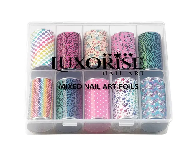 Set Folii Transfer LUXORISE Dream Big, 10 buc contine 10 tipuri de folii ce iti ofera diversitate atunci cand iti faci manichiura. Foliile de transfer sunt ideale pentru decorul unghiilor false sau al unghiilor naturale. Poti folosi folia de transfer pe intreaga suprafata a unghiei sau doar pentru a crea modele inedite de nail art. Aceasta ramane pe unghie doar in zona in care se aplica lipiciul special pentru folii. Lipiciul pentru foliile de transfer se poate aplica direct pe unghie sau peste un strat de lac de unghii apropiat de culoarea foliei. Mod de utilizare: Aplica lipiciul special pe toata suprafata unghiei sau doar in zona unde urmeaza sa aplici folia de transfer. Asteapta aproximativ 2-3 minute sa se usuce lipiciul. Cand acesta se usuca, devine transparent. Aplica folia pe unghie si preseaza pentru a intinde folia uniform pe suprafata acesteia. Trage folia, iar modelul va ramane transferat pe unghie in forma in care a fost aplicat lipiciul. Produsul cu denumirea Set Folii Transfer LUXORISE Dream Big, 10 buc face parte din brandul Luxorise, se afla in categoria Nail art si subcategoria