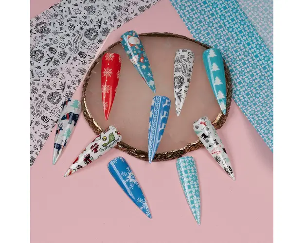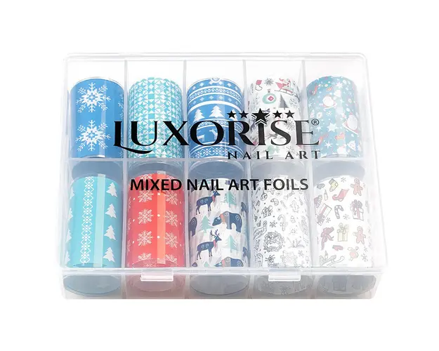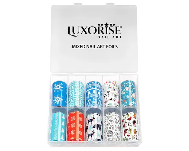 Set Folii Transfer LUXORISE Finally Christmas, 10 buc sunt ideale pentru decorul unghiilor tehnice dar pot fi folosite si pentru nail art pe unghiile naturale. Folia de transfer se poate folosi pe intreaga suprafata a unghiei sau doar pe o portiune pentru a crea modele creative de nail art. Aceasta ramane pe unghie doar in zona in care se aplica lipiciul special pentru folii. Lipiciul pentru foliile de transfer se poate aplica direct pe unghie sau peste un strat de lac de unghii apropiat de culoarea foliei. Mod de utilizare: Aplica lipiciul special pe toata suprafata unghiei sau doar in zona unde urmeaza sa aplici folia de transfer. Asteapta aproximativ 2-3 minute sa se usuce lipiciul. Cand acesta se usuca, devine transparent. Aplica folia pe unghie si preseaza pentru a intinde folia uniform pe suprafata acesteia. Trage folia, iar modelul va ramane transferat pe unghie in forma in care a fost aplicat lipiciul. Set 10 buc Produsul cu denumirea Set Folii Transfer LUXORISE Finally Christmas, 10 buc face parte din brandul Luxorise, se afla in categoria Nail art si subcategoria