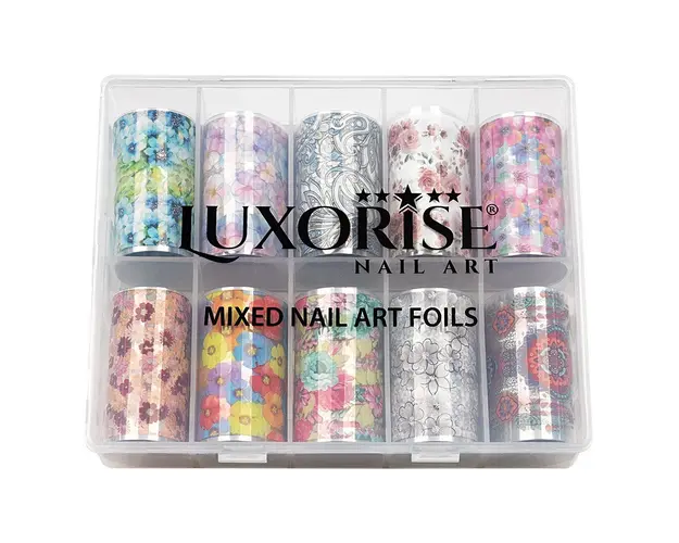 Set Folii Transfer LUXORISE Flower Future, 10 buc contine 10 tipuri de folii ce iti ofera diversitate atunci cand iti faci manichiura. Foliile de transfer sunt ideale pentru decorul unghiilor false sau al unghiilor naturale. Poti folosi folia de transfer pe intreaga suprafata a unghiei sau doar pentru a crea modele inedite de nail art. Aceasta ramane pe unghie doar in zona in care se aplica lipiciul special pentru folii. Lipiciul pentru foliile de transfer se poate aplica direct pe unghie sau peste un strat de lac de unghii apropiat de culoarea foliei. Mod de utilizare: Aplica lipiciul special pe toata suprafata unghiei sau doar in zona unde urmeaza sa aplici folia de transfer. Asteapta aproximativ 2-3 minute sa se usuce lipiciul. Cand acesta se usuca, devine transparent. Aplica folia pe unghie si preseaza pentru a intinde folia uniform pe suprafata acesteia. Trage folia, iar modelul va ramane transferat pe unghie in forma in care a fost aplicat lipiciul. Produsul cu denumirea Set Folii Transfer LUXORISE Flower Future, 10 buc face parte din brandul Luxorise, se afla in categoria Nail art si subcategoria