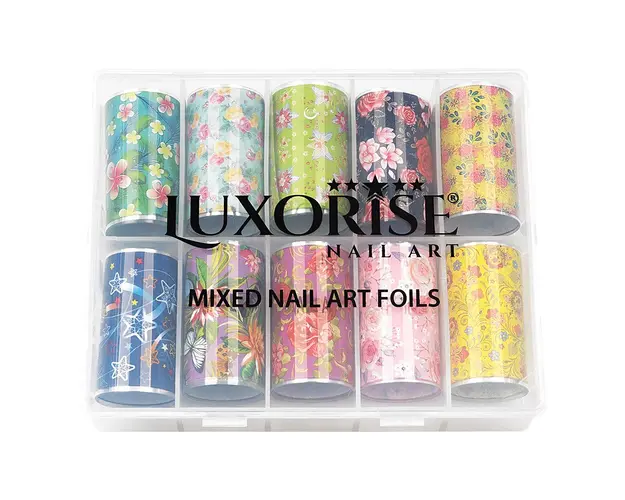 Set Folii Transfer LUXORISE Flower Lady, 10 buc contine 10 tipuri de folii ce iti ofera diversitate atunci cand iti faci manichiura. Foliile de transfer sunt ideale pentru decorul unghiilor false sau al unghiilor naturale. Poti folosi folia de transfer pe intreaga suprafata a unghiei sau doar pentru a crea modele inedite de nail art. Aceasta ramane pe unghie doar in zona in care se aplica lipiciul special pentru folii. Lipiciul pentru foliile de transfer se poate aplica direct pe unghie sau peste un strat de lac de unghii apropiat de culoarea foliei. Mod de utilizare: Aplica lipiciul special pe toata suprafata unghiei sau doar in zona unde urmeaza sa aplici folia de transfer. Asteapta aproximativ 2-3 minute sa se usuce lipiciul. Cand acesta se usuca, devine transparent. Aplica folia pe unghie si preseaza pentru a intinde folia uniform pe suprafata acesteia. Trage folia, iar modelul va ramane transferat pe unghie in forma in care a fost aplicat lipiciul. Produsul cu denumirea Set Folii Transfer LUXORISE Flower Lady, 10 buc face parte din brandul Luxorise, se afla in categoria Nail art si subcategoria
