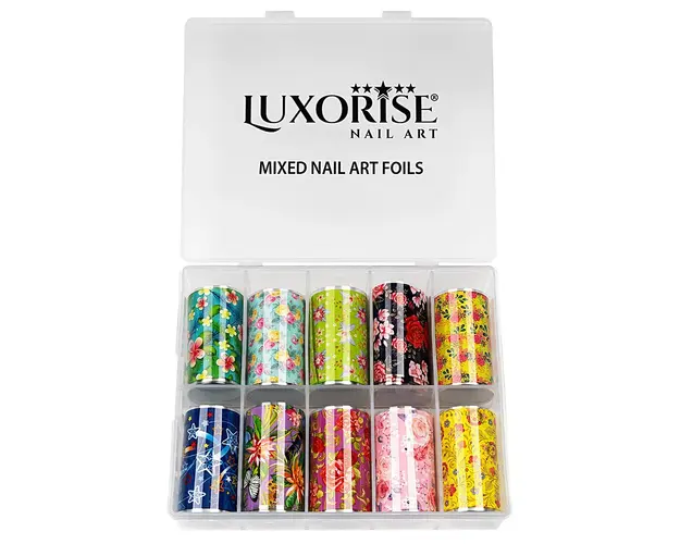Set Folii Transfer LUXORISE Flower Lady, 10 buc contine 10 tipuri de folii ce iti ofera diversitate atunci cand iti faci manichiura. Foliile de transfer sunt ideale pentru decorul unghiilor false sau al unghiilor naturale. Poti folosi folia de transfer pe intreaga suprafata a unghiei sau doar pentru a crea modele inedite de nail art. Aceasta ramane pe unghie doar in zona in care se aplica lipiciul special pentru folii. Lipiciul pentru foliile de transfer se poate aplica direct pe unghie sau peste un strat de lac de unghii apropiat de culoarea foliei. Mod de utilizare: Aplica lipiciul special pe toata suprafata unghiei sau doar in zona unde urmeaza sa aplici folia de transfer. Asteapta aproximativ 2-3 minute sa se usuce lipiciul. Cand acesta se usuca, devine transparent. Aplica folia pe unghie si preseaza pentru a intinde folia uniform pe suprafata acesteia. Trage folia, iar modelul va ramane transferat pe unghie in forma in care a fost aplicat lipiciul. Produsul cu denumirea Set Folii Transfer LUXORISE Flower Lady, 10 buc face parte din brandul Luxorise, se afla in categoria Nail art si subcategoria