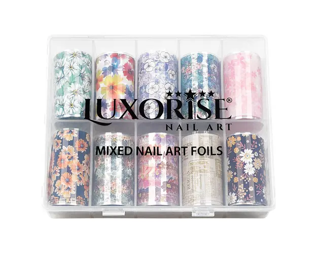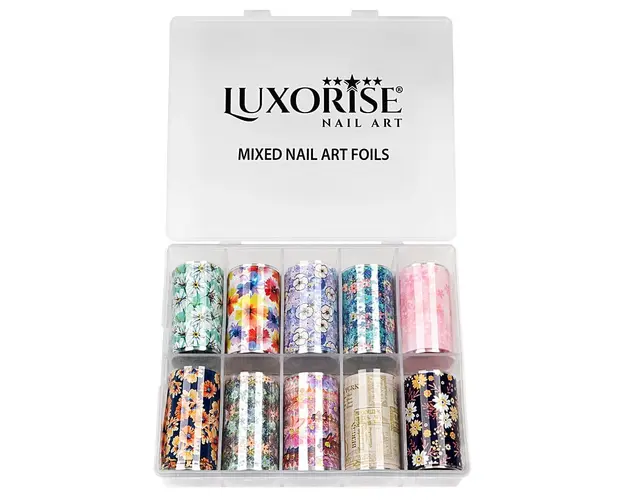 Set Folii Transfer LUXORISE Flower Whisper, 10 buc contine 10 tipuri de folii ce iti ofera diversitate atunci cand iti faci manichiura. Foliile de transfer sunt ideale pentru decorul unghiilor false sau al unghiilor naturale. Poti folosi folia de transfer pe intreaga suprafata a unghiei sau doar pentru a crea modele inedite de nail art. Aceasta ramane pe unghie doar in zona in care se aplica lipiciul special pentru folii. Lipiciul pentru foliile de transfer se poate aplica direct pe unghie sau peste un strat de lac de unghii apropiat de culoarea foliei. Mod de utilizare: Aplica lipiciul special pe toata suprafata unghiei sau doar in zona unde urmeaza sa aplici folia de transfer. Asteapta aproximativ 2-3 minute sa se usuce lipiciul. Cand acesta se usuca, devine transparent. Aplica folia pe unghie si preseaza pentru a intinde folia uniform pe suprafata acesteia. Trage folia, iar modelul va ramane transferat pe unghie in forma in care a fost aplicat lipiciul. Produsul cu denumirea Set Folii Transfer LUXORISE Flower Whisper, 10 buc face parte din brandul Luxorise, se afla in categoria Nail art si subcategoria