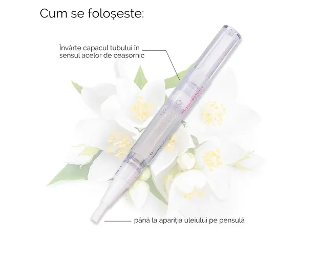 Uleiul pentru cuticule SensoPRO Milano este foarte usor de folosit datorita formei practice a sticlutei, ce se roteste si se aplica cu pensula pe marginea cuticulei. Uleiul pentru cuticule este un tratament pentru cuticule, are efect de hidratare si emoliere. Uleiul cu aroma de Jasmine inmoaie aspectul rigid al cuticulelor si le ofera catifelare si rezistenta. Pensula speciala se foloseste cu mare usurinta, necesitand doar o cantitate mica de lichid pentru a acoperi toata suprafata unghiei. Aroma deosebita a uleiului cu aroma de Jasmine te va cuceri imediat. In cazul cuticulelor foarte degradate, se insista cu o cantitate mai mare de ulei pentru o hidratare in profunzime. In cazul in care se doreste indepartarea cuticulelor, se recomanda folosirea unui bat din lemn cu care se imping delicat cuticulele in sensul invers de crestere. Gramaj: 8 ml Produsul cu denumirea Ulei Cuticule Stilou cu Jasmine SensoPRO Milano, Tratament Unghii face parte din brandul Sensopro milano, se afla in categoria Aparatura unghii si subcategoria