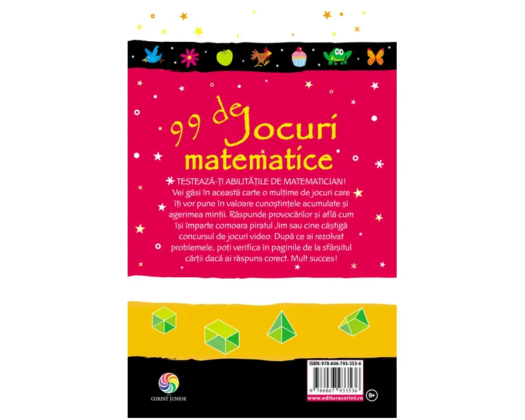 Testeaza-ti abilitatile de matematician! Vei gasi în aceasta carte o multime de jocuri care îti vor pune în valoare cunostintele acumulate si agerimea mintii. Raspunde provocarilor si afla cum îsi împarte comoara piratul Jim sau cine câstiga concursul de jocuri video. Dupa ce ai rezolvat problemele, poti verifica în paginile de la sfârsitul cartii daca ai raspuns corect. Mult succes! Produsul cu denumirea 99 de jocuri matematice face parte din brandul Corint, se afla in categoria Carti de sanatate si subcategoria