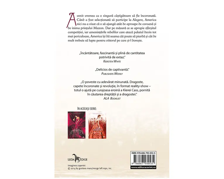 Colectia Leda Edge completeaza seria Alegerea de Kiera Cass cu un nou volum pe gustul segmentului young adult: Aleasa. A venit vremea ca o singura câstigatoare sa fie încoronata. Când a fost selectionata sa participe la Alegere, America nici nu a visat ca o sa ajunga atât de aproape de coroana si de inima printului Maxon. Dar pe masura ce se apropie sfârsitul competitiei, iar amenintarile rebelilor care ataca palatul devin tot mai periculoase, America îsi da seama cât poate sa piarda si cât de mult trebuie sa lupte pentru viitorul pe care si-l doreste. Produsul cu denumirea Aleasa (vol.3 din seria Alegerea) face parte din brandul Corint, se afla in categoria Carti de sanatate si subcategoria