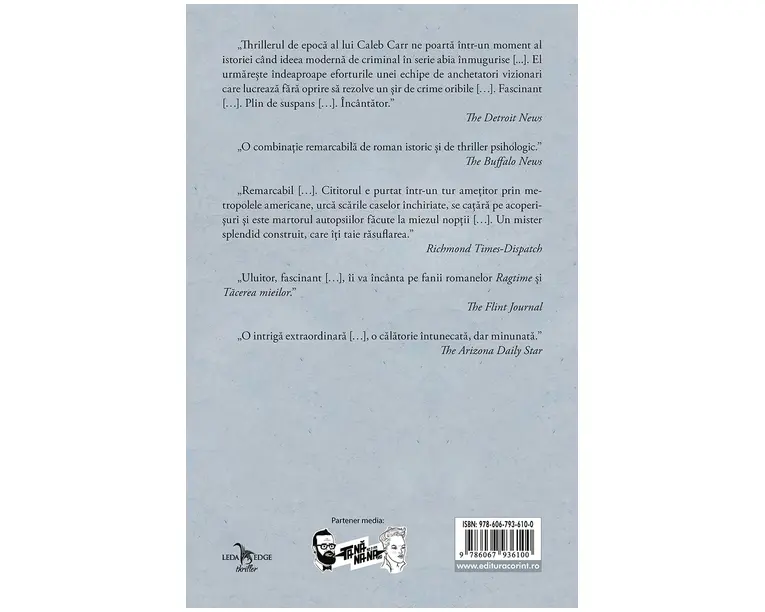 PESTE 2 MILIOANE DE EXEMPLARE VÂNDUTE ÎN ÎNTREAGA LUME! New York, 1896. Jurnalistul John Schuyler Moore este chemat de doctorul Laszlo Kreizler – psiholog sau „alienist” – sa vada trupul mutilat al unui adolescent, abandonat pe podul Williamsburg, aflat înca în constructie. De aici, cei doi prieteni încep o calatorie revolutionara pentru lumea criminalisticii: crearea profilului psihologic al ucigasului pe baza detaliilor crimelor sale. În timpul aventurii lor periculoase, descopera atât trecutul traumatizant, cât si mintea perversa a unui criminal care va ucide din nou, înainte ca vânatoarea lor sa se termine. Cu un ritm sustinut si captivant, marcat de amanunte istorice, Alienistul readuce în prim-plan New Yorkul din Epoca de Aur, cu blocurile si cu casele lui mari, cu politisti corupti si gangsteri extravaganti, cu cladirile stralucitoare ale celor doua Opere si bodegile sordide. Este o epoca în care, daca pui la îndoiala parerea generala ca toti criminalii se nasc criminali si sustii ca ei se formeaza în mijlocul societatii, poti suferi consecinte neasteptate si chiar fatale. Produsul cu denumirea Alienistul face parte din brandul Corint, se afla in categoria Carti de sanatate si subcategoria