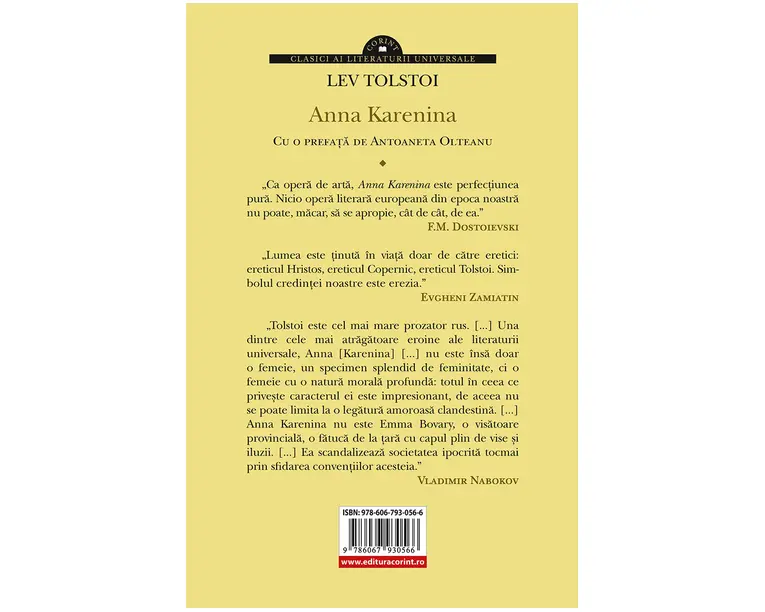 Colectia Corint Clasici ai literaturii universale se extinde cu o noua capodopera rusa: Anna Karenina de Lev Tolstoi. „Ca opera de arta, Anna Karenina este perfectiunea pura. Nicio opera literara europeana din epoca noastra nu poate, macar, sa se apropie, cât de cât, de ea.” F. M. DOSTOIEVSKI „Lumea este tinuta în viata doar de catre eretici: ereticul Hristos, ereticul Copernic, ereticul Tolstoi. Simbolul credintei noastre este erezia.” EVGHENI ZAMITIAN „Tolstoi este cel mai mare prozator rus. [...] Una dintre cele mai atragatoare eroine ale literaturii universale, Anna [Karenina] [...] nu este însa doar o femeie, un specimen splendid de feminitate, ci o femeie cu o natura morala profunda: totul în ceea ce priveste caracterul ei este impresionant, de aceea nu se poate limita la o legatura amoroasa clandestina. [...] Anna Karenina nu este Emma Bovary, o visatoare provinciala, o fatuca de la tara cu capul plin de vise si iluzii. [...] Ea scandalizeaza societatea ipocrita tocmai prin sfidarea conventiilor acesteia.” VLADIMIR NABOKOV Produsul cu denumirea Anna Karenina face parte din brandul Corint, se afla in categoria Carti de sanatate si subcategoria