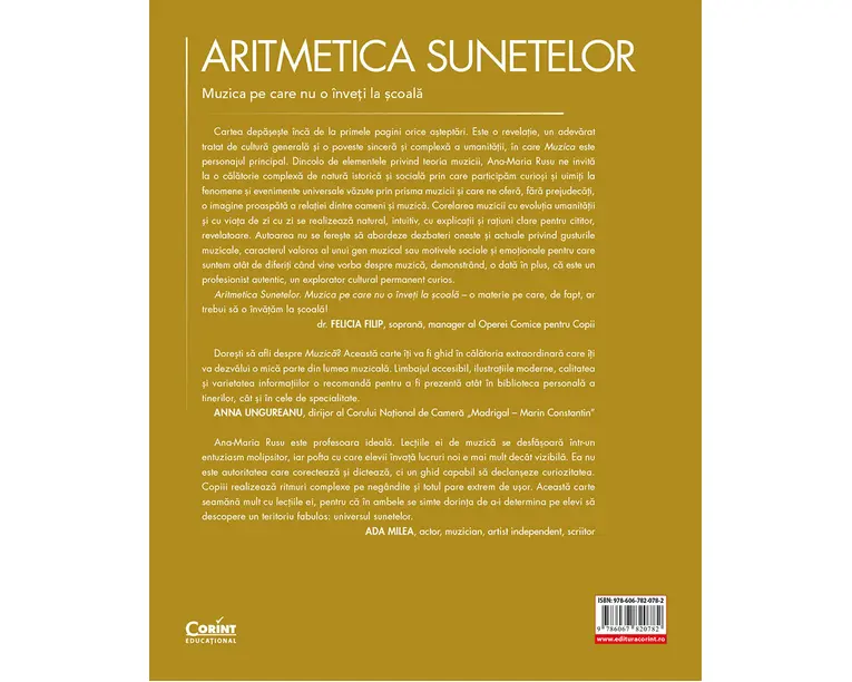 „Mi-am dorit mereu, ca profesor, sa fiu înteleasa de elevi. Descrierea elementelor muzicii din perspectiva elevului curios a fost ideea ce m-a însotit pe parcursul scrierii acestei lucrari si am încercat sa ofer cititorului o imagine diferita, mai profunda a muzicii, imagine pe care programa scolara nu o acopera. Copiii iubesc muzica, dar, din nefericire, reusesc în timp sa separe placerea de a o asculta de obligatia de a învata elementele ce o compun, acestea parându-li-se plictisitoare si inutile. Din acest motiv mi-am dorit sa vin în întâmpinarea nevoilor lor, întreaga lucrare fiind, poate, si un raspuns la întrebarile pe care mi le-au adresat de-a lungul timpului, o lectura interesanta pentru parinti si, de ce nu, un suport pentru colegii mei.” Ana-Maria Rusu „Ana-Maria Rusu este profesoara ideala. Lectiile ei de muzica se desfasoara într-un entuziasm molipsitor, iar pofta cu care elevii învata lucruri noi e mai mult decât vizibila. Ea nu este autoritatea care corecteaza si dicteaza, ci un ghid capabil sa declanseze curiozitatea. Copiii realizeaza ritmuri complexe pe negândite si totul pare extrem de usor. Aceasta carte seamana mult cu lectiile ei, pentru ca în ambele se simte dorinta de a-i determina pe elevi sa descopere un teritoriu fabulos: universul sunetelor.” ADA MILEA, actor, muzician, artist independent, scriitor „Lucrarea Anei-Maria Rusu sta sub semnul general al unei antrenante experiente de descoperire. Scrisa tihnit, personal, generos, cartea e o calatorie în opt capitole prin limbajul, instrumentele, tehnicile, formele si genurile muzicii de la începuturile istoriei si pâna în prezent. Daca ai deja curiozitati muzicale, în carte si autorul ei îti vei gasi doi prieteni buni. Daca nu, deschizând cartea sigur le vei avea. În oricare dintre cazuri te regasesti, lectura îti va prilejui bucurii, regasiri, surprize si mirari dintre cele mai frumoase.” Mihaela Mitescu Manea, lector universitar la Universitatea de Vest din Timisoara, Departamentul de Stiinte ale Educatiei „Doresti sa afli despre Muzica? Aceasta carte îti va fi ghid în calatoria extraordinara care îti va dezvalui o mica parte din lumea muzicala. Limbajul accesibil, ilustratiile moderne, calitatea si varietatea informatiilor o recomanda pentru a fi prezenta atât în biblioteca personala a tinerilor, cât si în cele de specialitate.” ANNA UNGUREANU, dirijor al Corului National de Camera „Madrigal – Marin Constantin” Cartea depaseste înca de la primele pagini orice asteptari. Este o revelatie, un adevarat tratat de cultura generala si o poveste sincera si complexa a umanitatii, în care Muzica este personajul principal. Dincolo de elementele privind teoria muzicii, Ana-Maria Rusu ne invita la o calatorie complexa de natura istorica si sociala prin care participam curiosi si uimiti la fenomene si evenimente universale vazute prin prisma muzicii si care ne ofera, fara prejudecati, o imagine proaspata a relatiei dintre oameni si muzica. Corelarea muzicii cu evolutia umanitatii si cu viata de zi cu zi se realizeaza natural, intuitiv, cu explicatii si ratiuni clare pentru cititor, revelatoare. Autoarea nu se fereste sa abordeze dezbateri oneste si actuale privind gusturile muzicale, caracterul valoros al unui gen muzical sau motivele sociale si emotionale pentru care suntem atât de diferiti când vine vorba despre muzica, demonstrând, o data în plus, ca este un profesionist autentic, un explorator cultural permanent curios. Aritmetica Sunetelor. Muzica pe care nu o înveti la scoala – o materie pe care, de fapt, ar trebui sa o învatam la scoala! dr. FELICIA FILIP, soprana, manager al Operei Comice pentru Copii „Volumul reuseste sa (cu)prinda cititorul într-o nota dinamica. Impresionanta este forta persoanei a doua utilizate în discurs, care imprima cartii un dialog între cel care stie sa sfatuiasca în ale muzicii si novicele care încearca sa devina tot mai constient de dinamica muzicii atât din perspectiva diacronica, cât si sincronica. Punctul forte al cartii nu se afla într-un anumit capitol, ci mai degraba într-un supra-text, în atitudinea pe care o degaja textul – este vorba de un ethos empatic, autoarea purtându-se cu grija cu cititorul: îi explica, îl preia din realitatea lui si îi ofera perspectiva specialistului, dar si a celui pasionat de muzica, apoi revine la anumite concepte, ofera informatia gradat si nu omite ca, dupa ce cititorul percepe ideea, sa-i ofere libertatea sa caute informatii suplimentare, creându-se premisele unui dialog asumat despre/cu muzica.” Bogdan Ratiu, profesor de Limba si literatura româna – MERITO 2019 Produsul cu denumirea Aritmetica sunetelor. Muzica pe care nu o inveti la scoala face parte din brandul Corint, se afla in categoria Carti de sanatate si subcategoria