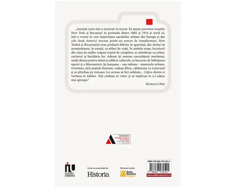 Cartea se ocupa de procesul de autoreflectare în care erau implicate orasele New York si Bucuresti în perioada care s-a scurs între sfârsitul Razboiului Civil American si izbucnirea Primului Razboi Mondial, interval care se suprapune cu domnia lui Carol I (1866–1914). Ghidurile, cartile de bucate si codurile de conduita contin câte o ideologie implicita, oferindu-le cititorilor modele pentru a-si construi identitatea. Cartile postale ilustrate, filmele si muzica se bazeaza pe un alt tip de coduri: spun povesti prin imagine si sunet, nu prin scris. Ideologia lor este însa identica aceleia care sta la baza textelor scrise. Mesajul implicit al textelor vizuale poate fi formulat în modul urmator: Priviti ce frumos e orasul vostru si iubiti-l! Priviti-va concetatenii, oamenii din toate starile! Priviti strazile, fiti atenti la oameni si observati cum arata cartierele. „Regizorul” din spatele scenei este vointa politica datorita careia orasul vostru – sau macar unele dintre cartierele acestuia – arata asa cum va apare el acum. Depinde de voi, locuitorii, cetatenii lui, sa aveti grija de aceasta imagine si sa o transformati într-o realitate pe termen lung! „Aceasta carte este o excursie în trecut. Ea spune povestea oraselor New York si Bucuresti în perioada dintre 1865 si 1914 si arata ca, într-o vreme în care majoritatea asezarilor urbane din Europa si din cele doua Americi treceau printr-un proces de transformare, New Yorkul si Bucurestiul erau profund diferite în aparenta, dar destul de asemanatoare, în esenta, ca stiluri de viata. În ambele orase, locuitorii din clasa de mijloc scapau treptat de complexe, se mândreau cu urbea, cartierul si bucataria lor. Adesea îsi onorau concetatenii merituosi, multi donau pentru statui si edificii culturale, se bucurau de înfiintarea operei si a filarmonicii, îsi însuseau – sau rafinau – manierele urbane, trimiteau carti postale ilustrate, vedeau filme, calatoreau cu tramvaiul si se plimbau pe trotuare (ce urmau sa fie) asfaltate... Câtiva dintre ei vorbeau la telefon. Toti credeau în viitor si se implicau în a-l aduce mai aproape.” Mariana Net Produsul cu denumirea Au fost odata doua orase face parte din brandul Corint, se afla in categoria Carti de sanatate si subcategoria