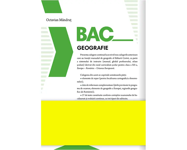 Prezenta culegere continua la un nivel nou culegerile anterioare care au însoţit manualul de geografie al Editurii Corint, ca parte a sistemului de instruire (manual, ghidul profesorului, atlase şcolare) derivat din noul curriculum şcolar pentru clasa a XII-a, Europa − România − Uniunea Europeana. nCulegerea din acest an cuprinde urmatoarele parţi:n• elemente de reper (pentru localizarea cartografica a fenomenelor);n• date de informare complementare (ţarile prevazute în programa de examen, elemente de geografie a Europei, regiunile geografice ale României);n• 27 de teste constituite conform cerinţelor examenului de bacalaureat şi evaluarii continue, cu trei tipuri de subiecte;n• baremele asociate testelor. Produsul cu denumirea Bacalaureat 2022 - Geografie face parte din brandul Corint, se afla in categoria Carti de sanatate si subcategoria