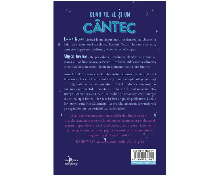 Emma Nolan viseaza la un singur lucru: sa danseze cu iubita ei la balul care marcheaza absolvirea liceului. Totusi, într-un oras mic, cum este Edgewater, Indiana, asa ceva e de neînchipuit. Alyssa Greene este presedinta Consiliului elevilor, în vreme ce mama ei conduce Asociatia Parinti-Profesori. Adolescenta admirata de toti are însa un secret: de un an si jumatate este iubita Emmei. Atunci când în oras începe sa umble vorba ca Emma planuieste sa vina la bal însotita de o fata, nu de un baiat, comunitatea plina de prejudecati din Edgewater ia foc, iar parintii si cadrele didactice ameninta cu anularea evenimentului. Acesta este momentul când în scena intra Barry Glickman si Dee Dee Allen, vedete pe Broadway, care hotarasc sa sustina lupta Emmei, dar si sa îi faca un pic de publicitate. Bunele lor intentii sunt însa zadarnicite, iar oraselul american se transforma pe negândite într-un veritabil teatru de razboi. „Balul este versiunea moderna a celebrului film Spirit rebel – o adolescenta îndrazneste sa îi înfrunte pe locuitorii oraselului natal pentru dreptul de a dansa. Este sfâsietor, plin de speranta, romantic si inteligent. Am dat ultima pagina a acestui roman cu un zâmbet larg pe chip si nadejde în suflet.” KASIE WEST, autoarea bestsellerului P.S.: Îmi placi „Balul este exact asa cum ti-ai dori sa fie balul tau de absolvire: magic, unic si cât se poate de amuzant!” RACHEL HAWKINS, autoarea romanului Her Royal Highness „Istetimea, luciditatea si povestea de iubire sincera din romanul Balul m-au cucerit iremediabil. Dupa ce îl vei citi, vei simti dorinta de a le lua partea protagonistelor, Emma si Alyssa, de a milita pentru drepturi egale si de a dansa noaptea întreaga.” AMY ROSE CAPETTA, autoarea romanului The Brilliant Death Produsul cu denumirea Balul face parte din brandul Corint, se afla in categoria Carti de sanatate si subcategoria