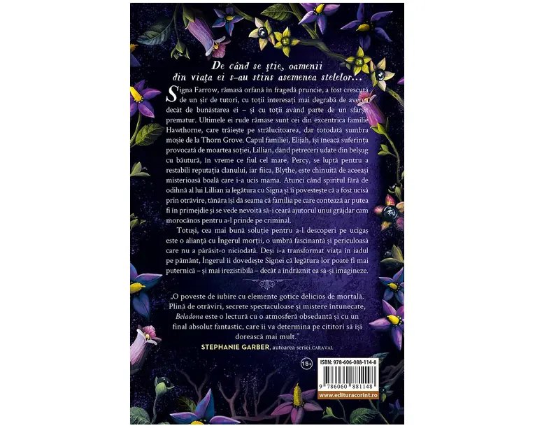 De cand se stie, oamenii din viata ei s-au stins asemenea stelelor... Signa Farrow, ramasa orfana in frageda pruncie, a fost crescuta de un sir de tutori, cu totii interesati mai degraba de averea decat de bunastarea ei si cu totii avand parte de un sfarsit prematur. Ultimele ei rude ramase sunt cei din excentrica familie Hawthorne, care traieste pe stralucitoarea, dar totodata sumbra mosie de la Thorn Grove. Capul familiei, Elijah, isi ineaca suferinta provocata de moartea sotiei, Lillian, dand petreceri udate din belsug cu bautura, in vreme ce fiul cel mare, Percy, se lupta pentru a restabili reputatia clanului, iar fiica, Blythe, este chinuita de aceeasi misterioasa boala care i-a ucis mama. Atunci cand spiritul fara de odihna al lui Lillian ia legatura cu Signa si ii povesteste ca a fost ucisa prin otravire, tanara isi da seama ca familia pe care conteaza ar putea fi in primejdie si se vede nevoita sa-i ceara ajutorul unui grajdar cam morocanos pentru a-l prinde pe criminal. Totusi, cea mai buna solutie pentru a-l descoperi pe ucigas este o alianta cu Ingerul mortii, o umbra fascinanta si periculoasa care nu a parasit-o niciodata. Desi i-a transformat viata in iadul pe pamant, Ingerul ii dovedeste Signei ca legatura lor poate fi mai puternica si mai irezistibila decat a indraznit ea sa-si imagineze. O poveste de iubire cu elemente gotice delicios de mortala. Plina de otraviri, secrete spectaculoase si mistere intunecate, Beladona este o lectura cu o atmosfera obsedanta si cu un final absolut fantastic, care ii va determina pe cititori sa isi doreasca mai mult.” STEPHANIE GARBER, autoarea seriei Caraval „O atmosfera decadenta! Aceasta poveste de dragoste gotica este plina de dorinta, tradare si, bineinteles, de moarte.” KERRI MANISCALCO, autoarea seriei-fenomen Anchetele lui Audrey Rose „Un roman intunecat, plin de rasturnari de situatie si delicios de gotic, Beladona este genul de basm malefic pe care l-am iubit aproape dintotdeauna. Lumea lui Grace este vie si sexy. Romantismul si relatiile sunt perfecte, si sunt convinsa ca cititorii se vor avanta cu capul inainte in lumea complexa din punct de vedere moral a Signei, asa cum am facut-o si eu.” RENÉE AHDIEH, autoarea romanului Urgia si zorile „In Beladona, Adalyn Grace a creat o poveste romantica intunecata care ii va captiva pe cititori. Lumea decadenta si povestea de dragoste interzisa imaginate de autoare reprezinta evadarea perfecta.” ADRIENNE YOUNG, autoarea romanului Cerul din adancuri Produsul cu denumirea Beladona (paperback) face parte din brandul Corint, se afla in categoria Creioane si subcategoria