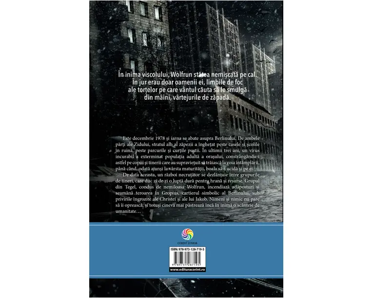 La Corint Junior, continuam seria Berlin cu al treilea volum Batalia din Gropius. O distopie captivanta care se adreseaza adolescentilor, scrisa de autorii italieni Fabie Geda si Marco Magnone. Este decembrie 1978 şi iarna se abate asupra Berlinului. De ambele parţi ale Zidului, stratul alb al zapezii a îngheţat peste casele şi şcolile în ruina, peste parcurile şi curţile pustii. În ultimii trei ani, un virus incurabil a exterminat populaţia adulta a oraşului, constrângându-i astfel pe copiii şi tinerii care au supravieţuit sa traiasca la voia întâmplarii, pâna când, odata ajunşi la vârsta maturitaţii, boala sa-i ucida şi pe ei. De data aceasta, un razboi necruţator se dezlanţuie între grupurile de tineri, care duc zi de zi o lupta dura pentru hrana şi resurse. Grupul din Tegel, condus de nemiloasa Wolfrun, incendiaza adaposturi şi seamana teroarea în Gropius, cartierul simbolic al Berlinului, sub privirile îngrozite ale Christei si ale lui Jakob. Nimeni si nimic nu pare sa îi opreasca, si totusi cineva mai pastreaza înca în inima o scânteie de umanitate... Produsul cu denumirea BERLIN. Batalia din Gropius (vol.3 din seria BERLIN) face parte din brandul Corint, se afla in categoria Carti de sanatate si subcategoria