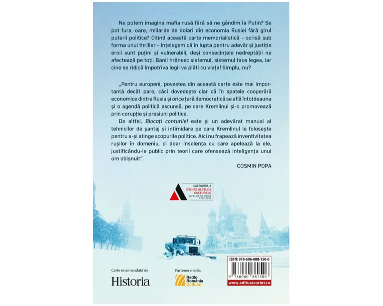 Ne putem imagina mafia rusa fara sa ne gandim la Putin? Se pot fura, oare, miliarde de dolari din economia Rusiei fara girul puterii politice? Citind aceasta carte memorialistica scrisa sub forma unui thriller intelegem ca in lupta pentru adevar si justitie eroii sunt putini si vulnerabili, desi consecintele nedreptatii ne afecteaza pe toti. Banii hranesc sistemul, sistemul face legea, iar cine se ridica impotriva legii va plati cu viata! Simplu, nu? „Pentru europeni, povestea din aceasta carte este mai importanta decat pare, caci dovedeste clar ca in spatele cooperarii economice dintre Rusia si orice tara democratica se afla intotdeauna si o agenda politica ascunsa, pe care Kremlinul si-o promoveaza prin coruptie si presiuni politice. De altfel, Blocati conturile! este si un adevarat manual al tehnicilor de santaj si intimidare pe care Kremlinul le foloseste pentru a-si atinge scopurile politice. Aici nu frapeaza inventivitatea rusilor in domeniu, ci doar insolenta cu care apeleaza la ele, justificandu-le public prin teorii care ofenseaza inteligenta unui om obisnuit.ˮ Cosmin Popa „Cartea lui Bill Browder despre afacerea Magnitki urmareste traseul banilor pana la nivelul superior al cleptocratiei criminale din Rusia. Blocati conturile! trebuie sa fie o lectura obligatorie.ˮ TOM STOPPARD, dramaturg „Browder arata ca un singur om curajos poate face diferenta. Este un mesaj inspirator de care trebuie sa tinem seama urgent cu totii.ˮ GARRY KASPAROV, legendar sahist si presedinte al Renew Democracy Initiative „Noua carte palpitanta a lui Browder exploreaza inima intunecata a coruptiei. Arata ce poate face o persoana in fata unei coruptii atat de perfide si ce putem gasi in noi insine pentru a ne ridica si a rezista acelor forte care fura, insala si ucid pentru propriul castig.ˮ ELIOT HIGGINS, fondatorul site-ului de investigatii Belingcat Produsul cu denumirea Blocati conturile! Crima si spalare de bani in Rusia lui Putin face parte din brandul Corint, se afla in categoria Carti de sanatate si subcategoria