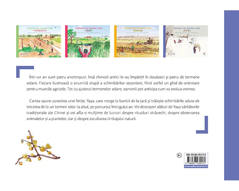 Desi acum copacii sunt dezgoliti si rar se mai vad micile animale salbatice pe câmp, în aer se simte parfumul orhideei imperiale, simbol al perfectiunii estetice, asa cum spuneau chinezii din Antichitate. Prima ninsoare este si un semnal pentru cultivatorii de fructe, care trebuie sa-si protejeze pomii de înghet. Acum, oamenii se strâng la gura sobei si se rasfata cu cartofi dulci copti, iar în perioada Solstitiului de iarna nu lipsesc de la masa coltunasii chinezesti. Sosirea Anului Nou înseamna sfârsitul celor trei luni de iarna. Asta înseamna ca primavara se pregateste sa reapara pe scena si începe, astfel, un nou ciclu de 24 de termene solare. Produsul cu denumirea Calatorie prin traditiile Chinei - Iarna face parte din brandul Corint, se afla in categoria Carti de sanatate si subcategoria