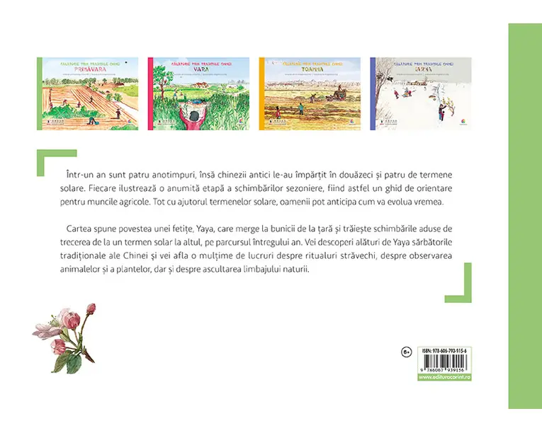 În Calatorie prin traditiile Chinei – Primavara vei afla despre cea mai importanta sarbatoare din China, Festivalul primaverii, dedicata reuniunilor de familie, si despre Festivalul lampioanelor, un alt moment în care familiile se aduna laolalta pentru a savura yuanxiao (bilute de orez cu umplutura dulce). Te vei bucura de privelistea spectaculoasa a bujorilor în floare la trei zile dupa Ploaia recoltelor, iar la finalul cartii, poti învata un joc nou, unul dintre cele preferate de micii locuitori ai Chinei. Descopera alaturi de Yaya, o fetita dulce si simpatica, sarbatorile tradiţionale nemaiîntâlnite ale Chinei şi vei fi de-a dreptul fascinat. Produsul cu denumirea Calatorie prin traditiile Chinei - Primavara face parte din brandul Corint, se afla in categoria Carti de sanatate si subcategoria