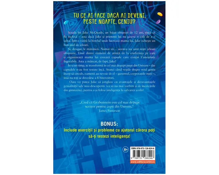 TU CE AI FACE DACA AI DEVENI, PESTE NOAPTE, GENIU? Scoala lui Jake McQuade, un baiat obisnuit de 12 ani, risca sa fie inchisa asta daca Jake si prietenii lui nu gasesc o cale de a o salva. Intr-o vizita la hotelul unde lucreaza mama lui, Jake ocheste un borcanel de jeleuri. Si, desigur, le mananca. Numai ca… acestea nu sunt niste jeleuri obisnuite. Unul dintre oamenii de stiinta de la conferinta pe care o organizeaza mama lui creeaza capsule cu Cunostinte Ingerabile. Asta a mancat, de fapt, Jake! In scurt timp, se transforma in cel mai destept pusti din Univers dar capsulele n-au fost testate inca. Atunci cand vestile despre noul geniu incep sa circule, oamenii au nevoie de el guvernul, corporatiile mari , insa nu toti se dovedesc a fi binevoitori. Oare va putea Jake sa jongleze cu avantajele si dezavantajele genialitatii sale nou-descoperite (ca sa nu mai vorbim si de incercarile din gimnaziu), pentru a-si folosi inteligenta la salvarea scolii? „Cred ca Grabenstein este cel mai destept scriitor pentru copii din Univers.” James Patterson „Ingenioasa, extrem de sprintena si incredibil de amuzanta Chris Grabenstein a facut-o din nou.” STUART GIBBS, autorul cartii Scoala de spionaj, bestseller The New York Times „Grabenstein revine cu inca o nastrusnicie plina de informatii si ghicitori; si cu un umor de o calitate deosebita. Ingenioasa, succinta si captivanta.” Kirkus Reviews „Grabenstein livreaza din nou... o carte care ii va atrage chiar si pe cei mai reticenti cititori.” School Library Journal Produsul cu denumirea Cel mai destept pusti din Univers face parte din brandul Corint, se afla in categoria Carti de sanatate si subcategoria