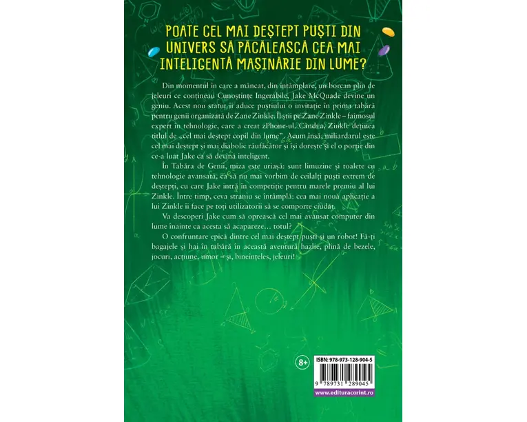 POATE CEL MAI DESTEPT PUSTI DIN UNIVERS SA PACALEASCA CEA MAI INTELIGENTA MASINARIE DIN LUME? Din momentul in care a mancat, din intamplare, un borcan plin de jeleuri ce contineau Cunostinte Ingerabile, Jake McQuade devine un geniu. Acest nou statut ii aduce pustiului o invitatie in prima tabara pentru genii organizata de Zane Zinkle. Il stii pe Zane Zinkle faimosul expert in tehnologie, care a creat zPhone-ul. Candva, Zinkle detinea titlul de „cel mai destept copil din lume”. Acum insa, miliardarul este cel mai destept si mai diabolic raufacator si isi doreste si el o portie din ce-a luat Jake ca sa devina inteligent. In Tabara de Genii, miza e uriasa: sunt limuzine si toalete cu tehnologie avansata, ca sa nu mai vorbim de ceilalti pusti extrem de destepti, cu care Jake intra in competitie pentru marele premiu al lui Zinkle. Intre timp, ceva straniu se intampla: cea mai noua aplicatie a lui Zinkle ii face pe toti utilizatorii sa se comporte ciudat. Va descoperi Jake cum sa opreasca cel mai avansat computer din lume inainte ca acesta sa acapareze… totul? O confruntare epica dintre cel mai destept pusti si un robot! Fa-ti bagajele si hai in tabara in aceasta aventura hazlie, plina de bezele, jocuri, actiune, umor si, bineinteles, jeleuri! „Alimentata de jeleuri speciale, promite sa asigure distractie pe cinste si sa fie evadarea perfecta. The New York Times „Cred ca Chris Grabenstein este cel mai destept scriitor pentru copii din Univers.” JAMES PATTERSON „Aceasta aventura hazlie este si o scrisoare de dragoste plina de umor, adresata invatamantului public si profesorilor dedicati.” Publishers Weekly Produsul cu denumirea Cel mai destept pusti din Univers. Tabara de Genii face parte din brandul Corint, se afla in categoria Carti de sanatate si subcategoria