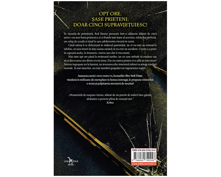 Autoarea seriei CRIMA PERFECTA, bestseller New York Times, vanduta in milioane de exemplare in lumea intreaga, le propune cititorilor o noua si palpitanta aventura de neuitat! In vacanta de primavara, Red Kenny porneste intr-o calatorie alaturi de cinci amici: cea mai buna prietena a ei si fratele mai mare al acesteia, iubita lui perfecta, un coleg de scoala si tipul la care adolescenta viseaza in taina. Cand rulota li se defecteaza in mijlocul pustietatii, iar ei nu mai au semnal la telefon, cei sase tineri isi dau seama curand ca nu este un accident. Cineva i-a prins in capcana acolo, in intuneric, cineva care clar ii vrea morti. Mai sunt opt ore pana la revarsatul zorilor, iar cei sase trebuie sa evadeze sau sa-si dea seama care dintre ei este tinta. Dar nu cumva printre ei se afla un mincinos? Secrete ingropate ies la lumina, iar tensiunea din interiorul rulotei va atinge niveluri mortale. Si mai naucitor, nu toti membrii grupului vor supravietui noptii… „Momentele de suspans intens, alaturi de un puzzle de indicii bine gandit, alcatuiesc o poveste plina de senzatii tari.” Kirkus „Aluziile la o posibila poveste de dragoste si o decizie plina de speranta ajuta la construirea unei atmosfere marcate de o revarsare neobosita de violenta si tensiune, invaluite intr-un ton melancolic. […] Un thriller care te va face sa iti rozi unghiile din pricina suspansului.” Publishers Weekly Produsul cu denumirea Cine moare in zori (softcover) face parte din brandul Corint, se afla in categoria Carti de sanatate si subcategoria