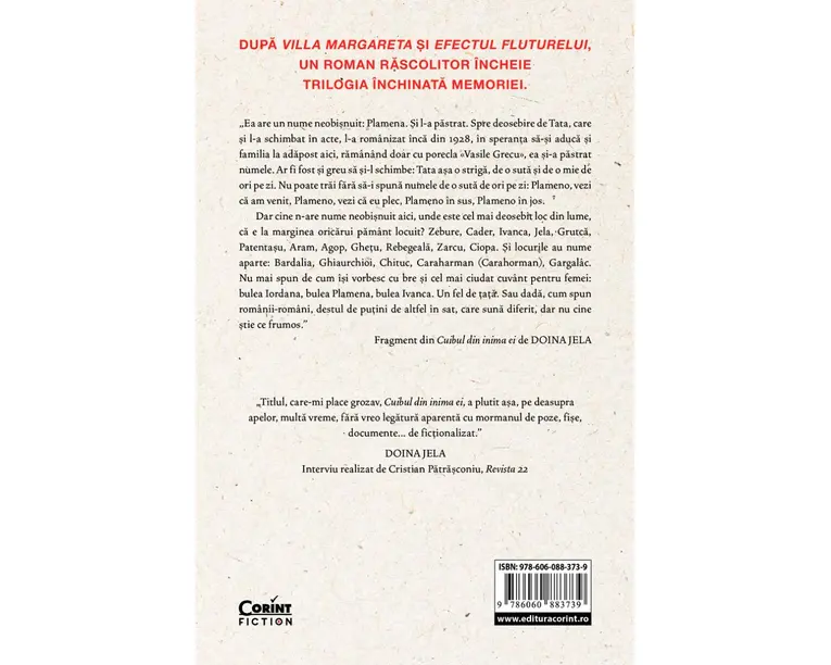 Roman cu tenta autobiografica despre bunicii si parintii naratoarei si o intreaga comunitate de nationalitati diferite (greci, bulgari, turci, romani) traitoare in localitatea dobrogeana Vadu (numele de azi al satului Carahorman/Caraharman). Povestile acestei familii se deruleaza de-a lungul istoriei pana in prezent, redescoperite de naratoare prin intermediul Caietului unchiului sau, care si-a pus pe hartie, la indemnul acesteia, memoriile. Naratiunea ne poarta in cercuri concentrice de la mica la marea istorie, uneori ratacindu-ne, alteori privind lucrurile din unghiuri diferite ca sa ajungem, in cele din urma, dupa trairi intense, la cuibul din inima ei, al mamei, al bunicii, al acestei localitati fabuloase, un Macondo la malul marii. „Titlul, care-mi place grozav, Cuibul din inima ei, a plutit asa, pe deasupra apelor, multa vreme, fara vreo legatura aparenta cu mormanul de poze, fise, documente... de fictionalizat.” DOINA JELA, Interviu realizat de Cristian Patrascoiu, Revista 22 „De cate ori am chemat-o pe Doina Jela in platoul de televiziune, am regretat ca am vorbit prea putin despre literatura si mai mult despre istorie, trauma, comunism. Cu acest roman autoarea devine intai de toate prozatoare si modifica ierarhiile curente ale literaturii. Un roman puternic si care se citeste pe nerasuflate. Pentru care va trebui sa ma gandesc la un «Mic dejun...» filmat si dedicat in intregime cartilor ei de fictiune.” DANIELA ZECA-BUZURA „Un CUIB imaginar? reconstituit? Nu stim. Stim doar ce a incaput in el: un spatiu magic, la marginea marii, niste personaje incredibile, umor, tragism, o uriasa fantezie si mersul inainte si inapoi al istoriei. O minunatie de carte!” EMA STERE Produsul cu denumirea Cuibul din inima ei face parte din brandul Corint, se afla in categoria Carti de sanatate si subcategoria