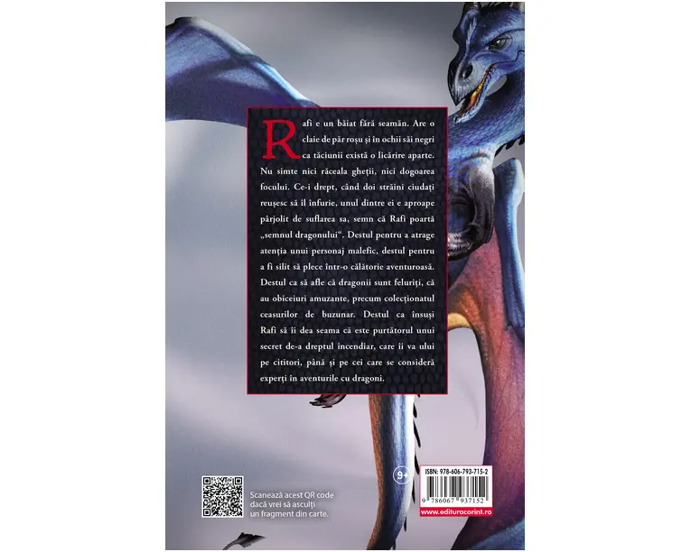 Rafi e un baiat fara seaman. Are o claie de par rosu si în ochii sai negri ca taciunii exista o licarire aparte. Nu simte nici raceala ghetii, nici dogoarea focului. Ce-i drept, când doi straini ciudati reusesc sa îl înfurie, unul dintre ei e aproape pârjolit de suflarea sa, semn ca Rafi poarta „semnul dragonului“. Destul pentru a atrage atentia unui personaj malefic, destul pentru a fi silit sa plece într-o calatorie aventuroasa. Destul ca sa afle ca dragonii sunt feluriti, ca au obiceiuri amuzante, precum colectionatul ceasurilor de buzunar. Destul ca însusi Rafi sa îsi dea seama ca este purtatorul unui secret de-a dreptul incendiar, care îi va ului pe cititori, pâna si pe cei care se considera experti în aventurile cu dragoni. Produsul cu denumirea Cuibul dragonului face parte din brandul Corint, se afla in categoria Carti de sanatate si subcategoria