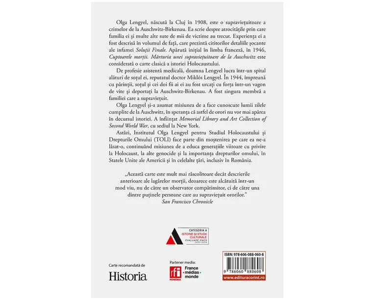 Olga Lengyel, nascuta la Cluj în 1908, este o supravietuitoare a crimelor de la Auschwitz-Birkenau. Ea scrie despre atrocitatile prin care familia ei si multe alte sute de mii de victime au trecut. Experienta ei a fost descrisa în volumul de fata, care prezinta cititorilor detaliile socante ale infamei Solutii finale. Aparuta initial în limba franceza, în 1946, Cuptoarele mortii. Marturia unei supravietuitoare de la Auschwitz este considerata o carte clasica a istoriei Holocaustului. De profesie asistenta medicala, doamna Lengyel lucra într-un spital alaturi de sotul ei, reputatul doctor Miklós Lengyel. În 1944, împreuna cu parintii, sotul si cei doi fii ai ei au fost urcati cu forta într-un vagon de vite si deportati la Auschwitz-Birkenau. A fost singura membra a familiei care a supravietuit. Olga Lengyel si-a asumat misiunea de a face cunoscute lumii zilele cumplite de la Auschwitz, în speranta ca astfel de orori nu vor mai aparea în decursul istoriei. A înfiintat Memorial Library and Art Collection of Second World War, cu sediul la New York. Astazi, Institutul Olga Lengyel pentru Studiul Holocaustului si Drepturile Omului (TOLI) face parte din mostenirea pe care ea ne-a lasat-o, continuând misiunea de a educa generatiile viitoare cu privire la Holocaust, la alte genocide si la importanta drepturilor omului, în Statele Unite ale Americii si în celelalte tari, inclusiv în România. „Multumesc pentru cartea foarte sincera, foarte bine scrisa. Ati facut un mare serviciu, lasându-i sa vorbeasca pe cei care sunt acum si în cea mai mare parte uitati...ˮ ALBERT EINSTEIN „Este imaginea iadului absolut.ˮ Saturday Review of Literature „Aceasta carte este mult mai rascolitoare decât descrierile anterioare ale lagarelor mortii, deoarece este alcatuita într-un mod vioi, nu de catre un observator compatimitor, ci de catre una dintre putinele persoane care au supravietuit ororilor.ˮ San Francisco Chronicle Produsul cu denumirea Cuptoarele mortii. Marturia unei supravietuitoare de la Auschwitz face parte din brandul Corint, se afla in categoria Carti de sanatate si subcategoria