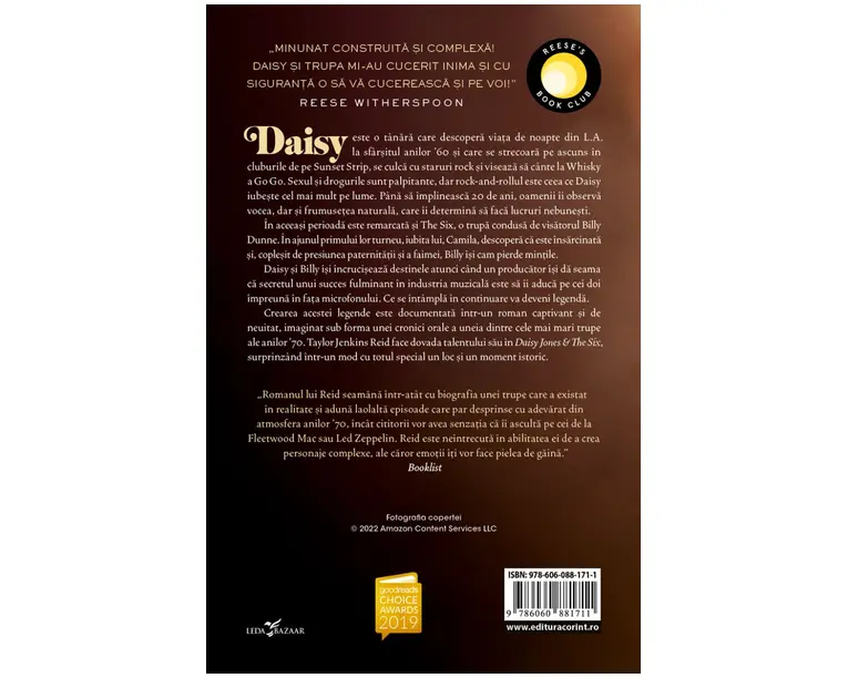 Daisy este o tanara care descopera viata de noapte din L.A. la sfarsitul anilor ’60 si care se strecoara pe ascuns in cluburile de pe Sunset Strip, se culca cu staruri rock si viseaza sa cante la Whisky a Go Go. Sexul si drogurile sunt palpitante, dar rock-and-rollul este ceea ce Daisy iubeste cel mai mult pe lume. Pana sa implineasca 20 de ani, oamenii ii observa vocea, dar si frumusetea naturala, care ii determina sa faca lucruri nebunesti. In aceeasi perioada este remarcata si The Six, o trupa condusa de visatorul Billy Dunne. In ajunul primului lor turneu, iubita lui, Camila, descopera ca este insarcinata si, coplesit de presiunea paternitatii si a faimei, Billy isi cam pierde mintile. Daisy si Billy isi incruciseaza destinele atunci cand un producator isi da seama ca secretul unui succes fulminant in industria muzicala este sa ii aduca pe cei doi impreuna in fata microfonului. Ce se intampla in continuare va deveni legenda. Crearea acestei legende este documentata intr-un roman captivant si de neuitat, imaginat sub forma unei cronici orale a uneia dintre cele mai mari trupe ale anilor ’70. Taylor Jenkins Reid face dovada talentului sau in Daisy Jones & The Six, surprinzand intr-un mod cu totul special un loc si un moment istoric. „Minunat construita si complexa! Daisy si trupa mi-au cucerit inima si cu siguranta o sa va cucereasca si pe voi!” Reese Witherspoon „Romanul lui Reid seamana intr-atat cu biografia unei trupe care a existat in realitate si aduna laolalta episoade care par desprinse cu adevarat din atmosfera anilor ’70, incat cititorii vor avea senzatia ca ii asculta pe cei de la Fleetwood Mac sau Led Zeppelin. Reid este neintrecuta in abilitatea ei de a crea personaje complexe, ale caror emotii iti vor face pielea de gaina.” Booklist „Daisy Jones & The Six este un roman captivant de la prima pana la ultima pagina […]. Personajele imaginate de autoare sunt atat de credibile, incat iti doresti sa poţi asculta cu adevarat albumele trupei, sa ii urmaresti concertele pe YouTube si sa ii cauti pe internet cele mai nebunesti momente, ca sa te convingi cu ochii tai.” HelloGiggles „Acest roman deopotriva modern si tulburator, prezentat sub forma unei istorii orale, are in prim-plan povestea imaginara a ascensiunii celei mai reprezentative trupe rock a anilor ’70, cu accent pe stilul de viata nonconformist al componentilor. Se citeste ca si cum ar fi transcrierea unui episod deosebit de picant al documentarului Behind the Music, difuzat pe VH1.” The New York Times Book Review „Pregatiti-va sa va indragostiti de romanul lui Taylor Jenkins Reid!” PopSugar „Deopotriva evocator si stralucitor!” Romper Produsul cu denumirea Daisy Jones & The Six face parte din brandul Corint, se afla in categoria Carti de sanatate si subcategoria