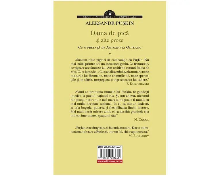 „Suntem nişte pigmei în comparaţie cu Puşkin. Nu mai exista printre noi un asemenea geniu. Ce frumuseţe, ce vigoare are fantezia lui! Am recitit de curând Dama de pica. Ce fantezie!... Cu o analiza subtila, el a urmarit toate mişcarile lui Hermann, toate chinurile lui, toate speranţele şi, în sfârşit, neaşteptata şi îngrozitoarea lui cadere.” F. Dostoievski „Când se pronunţa numele lui Puşkin, te gândeşti imediat la poetul naţional rus. Şi, într-adevar, niciunul din poeţii noştri nu e mai mare şi nu poate fi numit cu mai multa dreptate naţional. În el, ca într-un lexicon, se afla bogaţia, puterea şi flexibilitatea limbii noastre. Mai mult decât oricare altul, el i-a deschis graniţele şi a indicat imensitatea spaţiului sau.” N. Gogol „Puşkin este dragostea şi bucuria noastra. Este o minunata manifestare a Rusiei şi, într-un fel, chiar apoteoza sa.” M. Bulgakov Produsul cu denumirea Dama de pica si alte proze face parte din brandul Corint, se afla in categoria Carti de sanatate si subcategoria