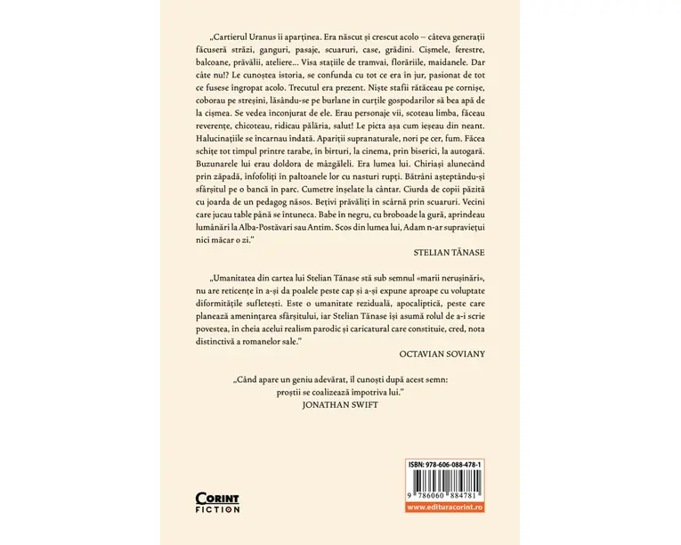 Romanul se desfasoara in jurul pictorului Adam Bruno, a carui moarte misterioasa il conduce pe jurnalistul Ghita Macarie la o investigatie care ne dezvaluie viata si destinul unui artist transformat in mit de Dascalime dupa 1989. Inainte vreme, Adam nu s-a sfiit sa spuna ce crede despre regimul la putere, suferind, ca atare, consecinte dintre cele mai aspre. Dupa 1990, personajul colectiv Dascalimea, Caracuda protipendada intelectuala a Guberniei, noii Tipatescu & Pristanda intoarce foaia si se transforma dintr-o adunatura grotesca de turnatori intr-un cor preamarindu-l ca pe un erou pe Adam, pentru a-si pastra astfel statutul social si material in noua epoca ce se prefigura. Doar ca Adam nu le face jocul si atunci Dascalimea trebuie sa scape de personajul pe care il creasera... In ce fel veti afla citind noul roman al scriitorului Stelian Tanase, in care veti recunoaste o lume caragialiana a zilelor noastre. „Contrastul violent dintre limbajul carturaresc sau cel incliftat al cremei societatii si batjocura veninoasa asezonata cu vorbe groase din stratul lexicului de sant care stau alaturi in aceeasi fraza e de un umor irezistibil, intr-o formula artistica impecabila.” CRISTIAN TEODORESCU, „La anticariatul cuvintelor”, revista Catavencii Produsul cu denumirea Dincolo nu e nimeni face parte din brandul Corint, se afla in categoria Carti de sanatate si subcategoria