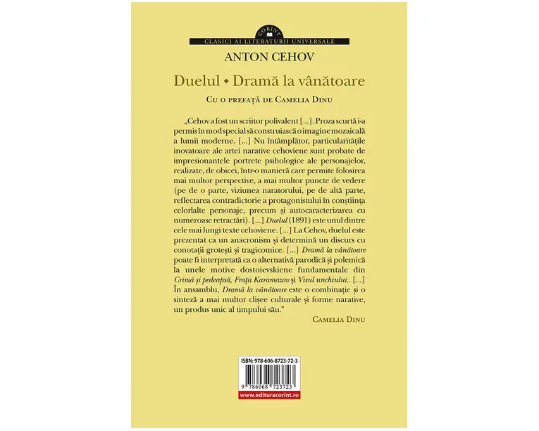 Editura Corint adauga o noua capodopera colectiei Clasici ai literaturii universale, dedicata adultilor: Duelul. Drama la vânatoare de Anton Cehov. „Cehov a fost un scriitor polivalent [...]. Proza scurta i-a permis în mod special sa construiasca o imagine mozaicala a lumii moderne. [...] Nu întâmplator, particularitatile inovatoare ale artei narative cehoviene sunt probate de impresionantele portrete psihologice ale personajelor, realizate, de obicei, într-o maniera care permite folosirea mai multor perspective, a mai multor puncte de vedere (pe de o parte, viziunea naratorului, pe de alta parte, reflectarea contradictorie a protagonistului în constiinta celorlalte personaje, precum si autocaracterizarea cu numeroase retractari). [...] Duelul (1891) este unul dintre cele mai lungi texte cehoviene. [...] La Cehov, duelul este prezentat ca un anacronism si determina un discurs cu conotatii grotesti si tragicomice. [...] Drama la vânatoare poate fi interpretata ca o alternativa parodica si polemica la unele motive dostoievskiene fundamentale din Crima si pedeapsa, Fratii Karamazov si Visul unchiului.. [...] În ansamblu, Drama la vânatoare este o combinatie si o sinteza a mai multor clisee culturale si forme narative, un produs unic al timpului sau.” Camelia Dinu Produsul cu denumirea Duelul. Drama la vanatoare face parte din brandul Corint, se afla in categoria Carti de sanatate si subcategoria