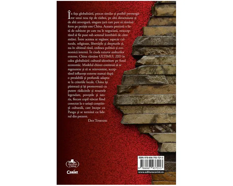 În fata globalizarii, proces similar si posibil premergator unui nou tip de razboi, pe alta dimensiune si de alta anvergura, singura tara care pare sa ramâna ferm pe pozitie este China. Aceasta prezinta o lista de subiecte pe care nu le negociaza, neacceptând sa fie puse sub semnul întrebarii de catre straini. Între acestea se regasesc aspecte culturale, religioase, libertatile si drepturile si, nu în ultimul rând, ordinea politica si economica interna. În ciuda tuturor asalturilor externe, China ramâne ULTIMUL ZID în calea globalizarii cultural-identitare pe fond economic. Modelul chinez continua sa se regenereze si sa se reinventeze, acceptând influente externe numai dupa o prealabila si profunda adaptare la criteriile locale. China îsi pastreaza si îsi promoveaza cu putere radacinile si resursele legendare, povestile si istoria, fiecare copil nascut fiind conectat la o uriasa constiinta culturala, care începe cu Pangu si se termina cu liderul din prezent. Dan Tomozei Produsul cu denumirea Dupa 70 de ani. Ultimul zid face parte din brandul Corint, se afla in categoria Carti de sanatate si subcategoria